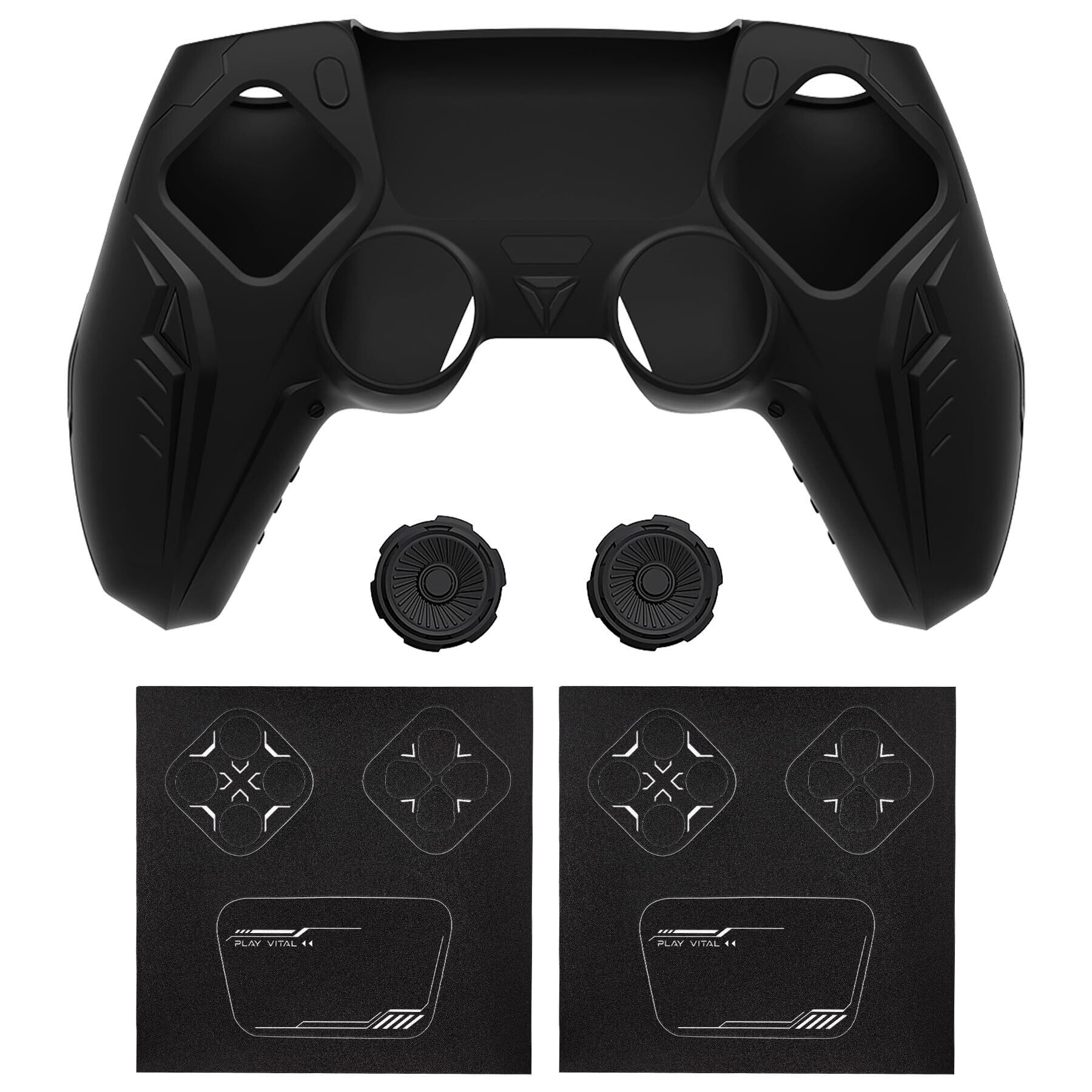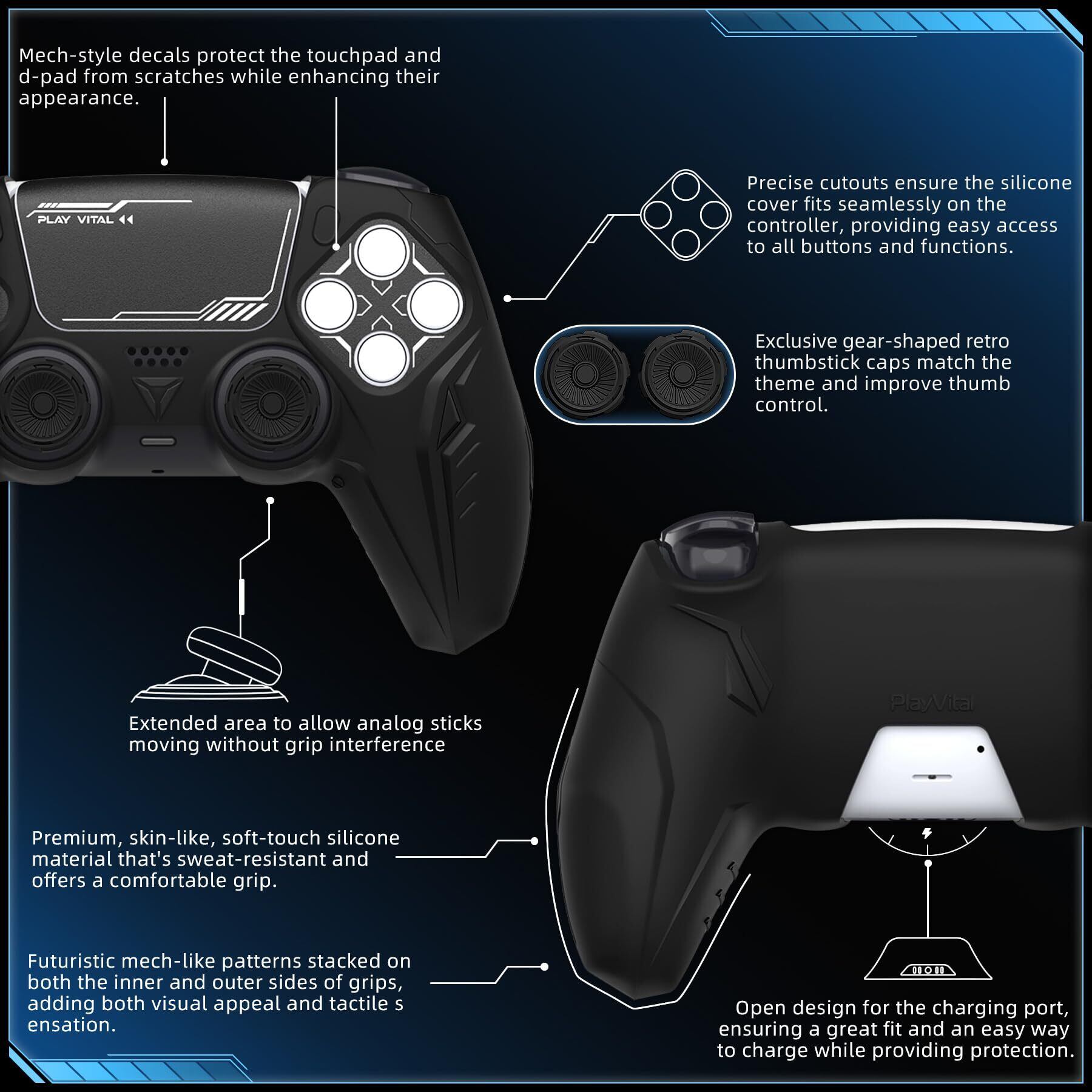PlayVital ps5コントローラー対応用グリップカバー、ps5対応用プレミアムシリコンカバー、ps5対応用サイバーメカデザイン保護カバー、カバー付けたままps5公式充電ドック対応します-ブラック