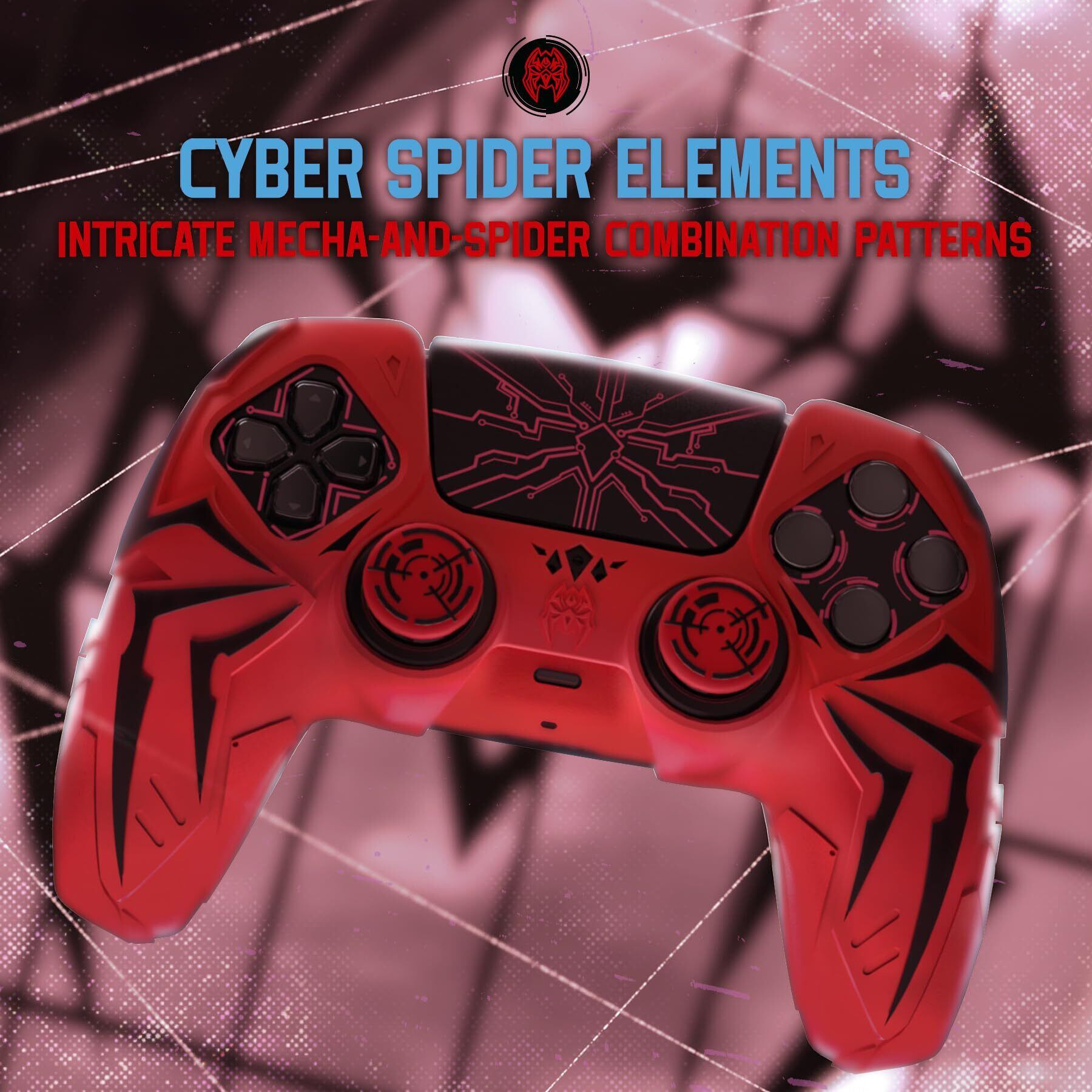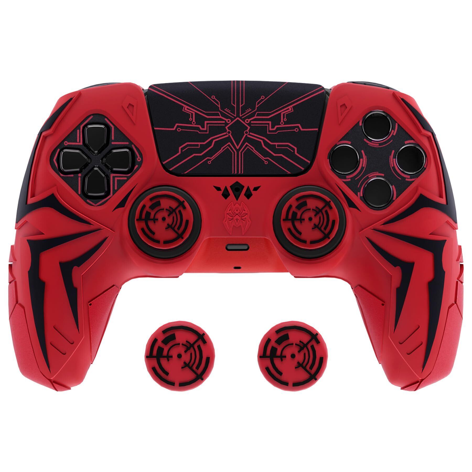 PlayVital ps5コントローラー対応用シリコン保護カバー、サイバースパイダーデザイン、サムグリップキャップ2個やステッカー6枚付属、グリップ付き滑り止め、耐衝撃、充電ドック対応-レッド&ブラック