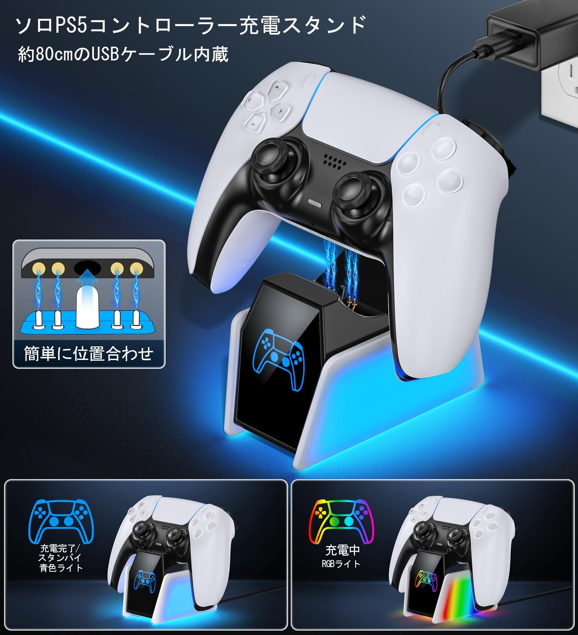 【限定セール】ソロ PS5 コントローラー 充電スタンド 収納スタンド 置くだけ充電 LED指示ランプ付き 過充電防止 コンパクト 軽量 PS5周辺機器 アクセサリー USBケーブル付 プレステ5 コントローラー充電器 デュアルセンスとDualsense Edgeに対応 1個入り