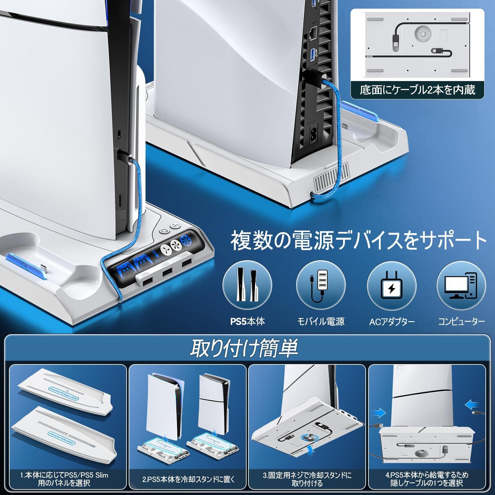 【PS5/新型 PS5 Slim対応】新型 PS5 Slim 縦置き 冷却 スタンド 自動/手動モードで風速調整 PS5 コントローラー 充電器 2台同時充電 充電指示ランプ付 2つ隠しケーブル PS5/PS5スリム通常版とデジタル版両対応 PS5 周辺機器 ホワイト