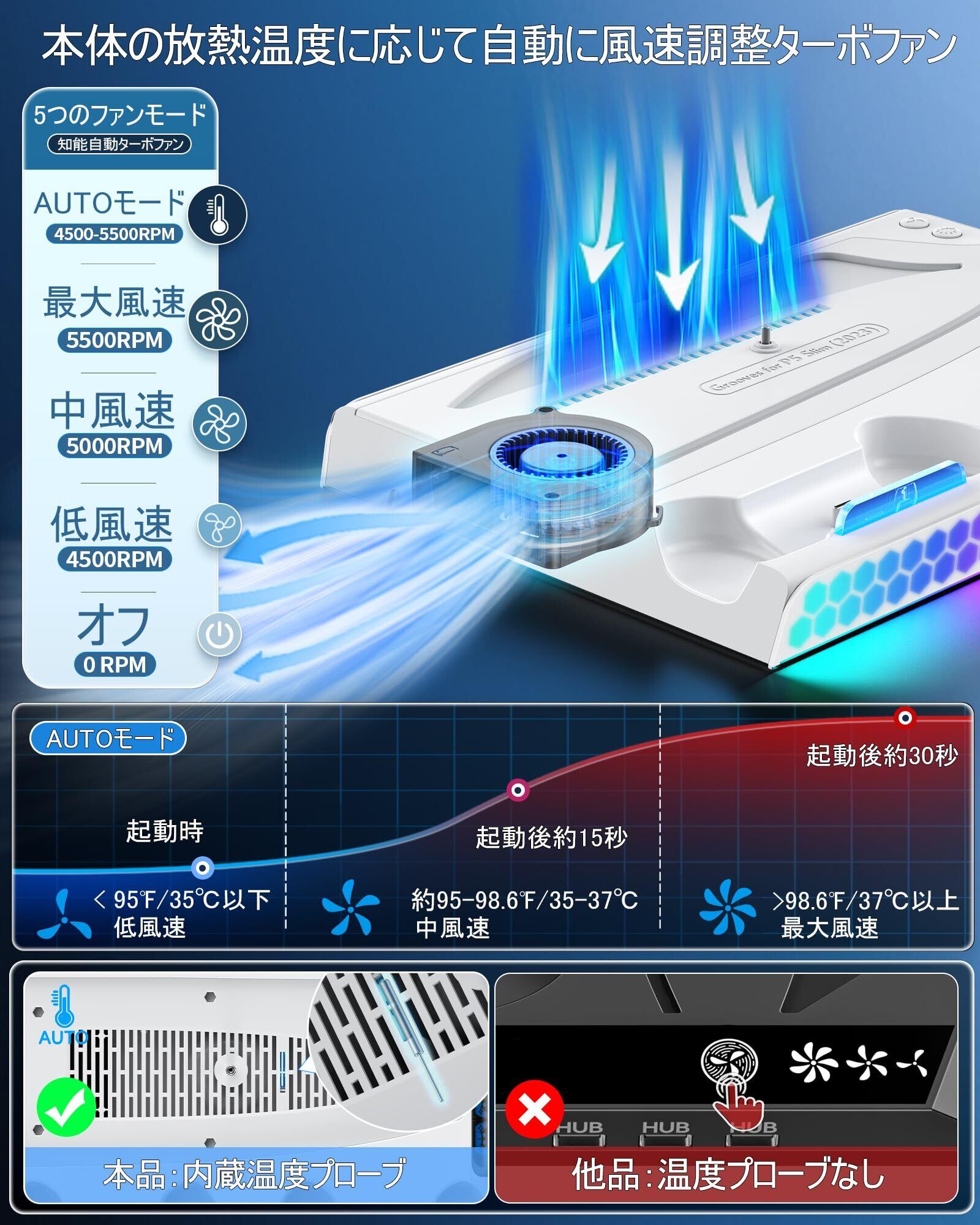 【AUTOモードで3段階風速調整】PS5冷却スタンドにはPS5本体の放熱温度を識別するためのプローブが内蔵されており、PS5本体の放熱温度に応じて、自動でファンの風速を最大風速(本体の放熱温度38℃以上)、中風速(本体の放熱温度約35-38℃)または低風速(本体の放熱温度35℃以下)に切り替えます。