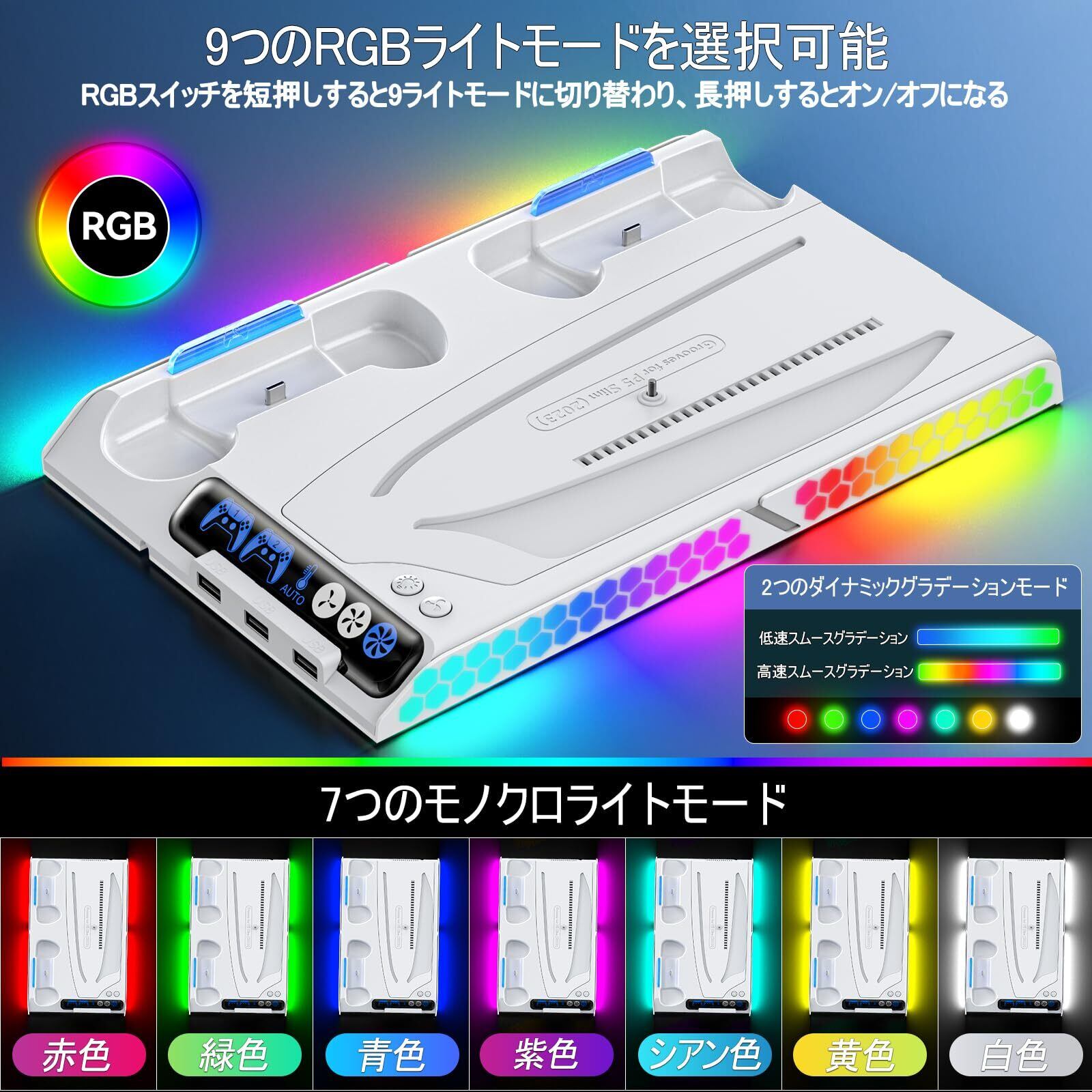 【9つのRGBライトモード選択可能】プレステ5 スタンド 縦置きはRGBライトがあり、7種類のモノクロモードと2種類のカラーグラデーションモードを選択可能です。ゲーム環境に応じてお好みのRGBライトモードを選択、ゲーム体験を一層豊かにしてくれます。