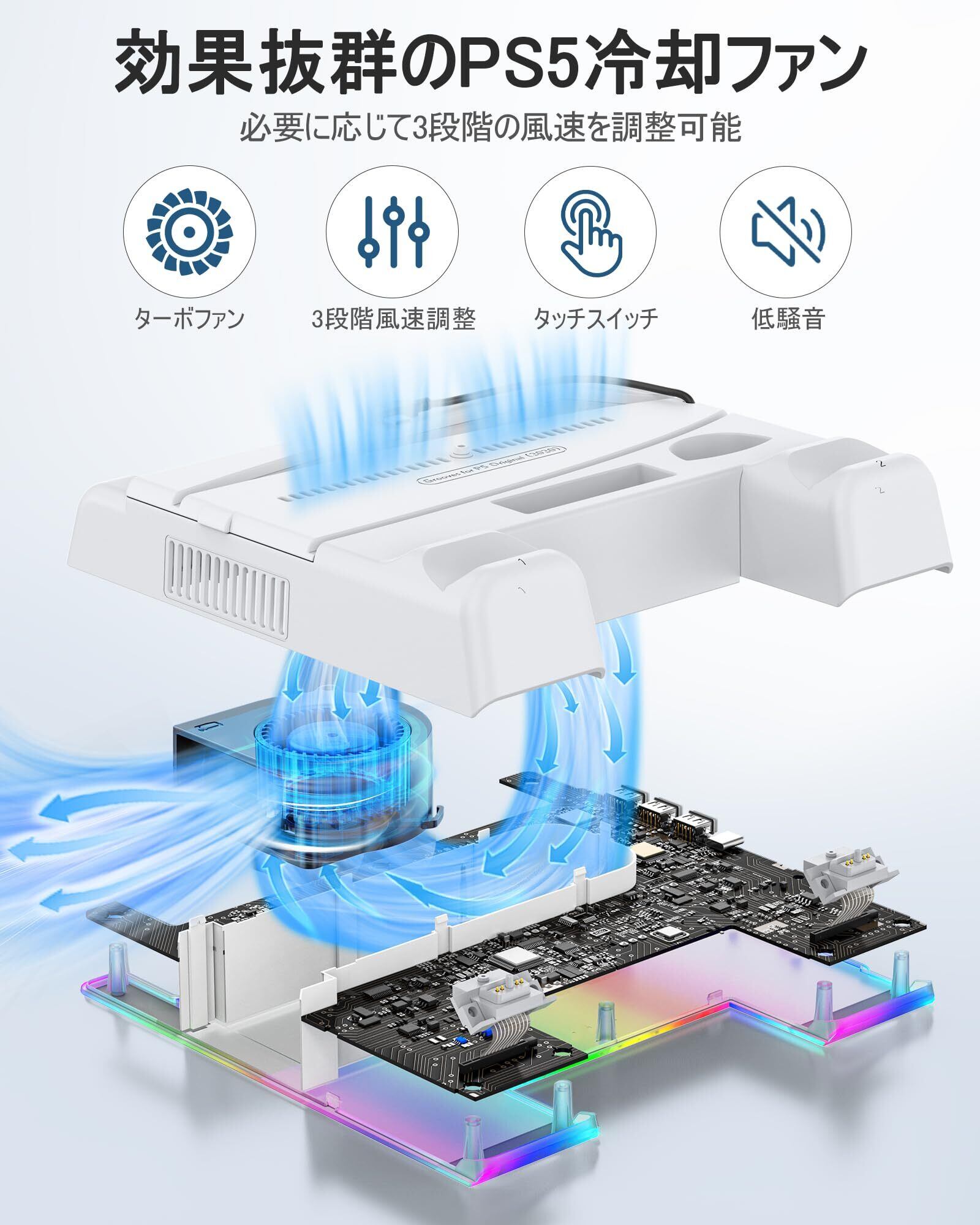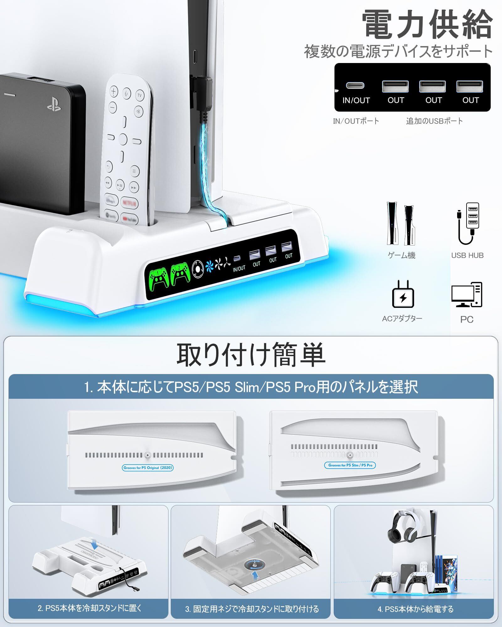 【PS5/PS5 Slim/PS5 Pro対応】PS5 Slim 縦置き 冷却 スタンド 3段階風速調整PS5冷却ファン PS5 コントローラー 充電器 2台同時充電 充電指示ランプ付 ゲームディスク/ヘッドセット/ディスクドライブ/リモコン収納 プレステ5/PS5スリム/プロ通常版とデジタル版両対応 PS5 周辺機器