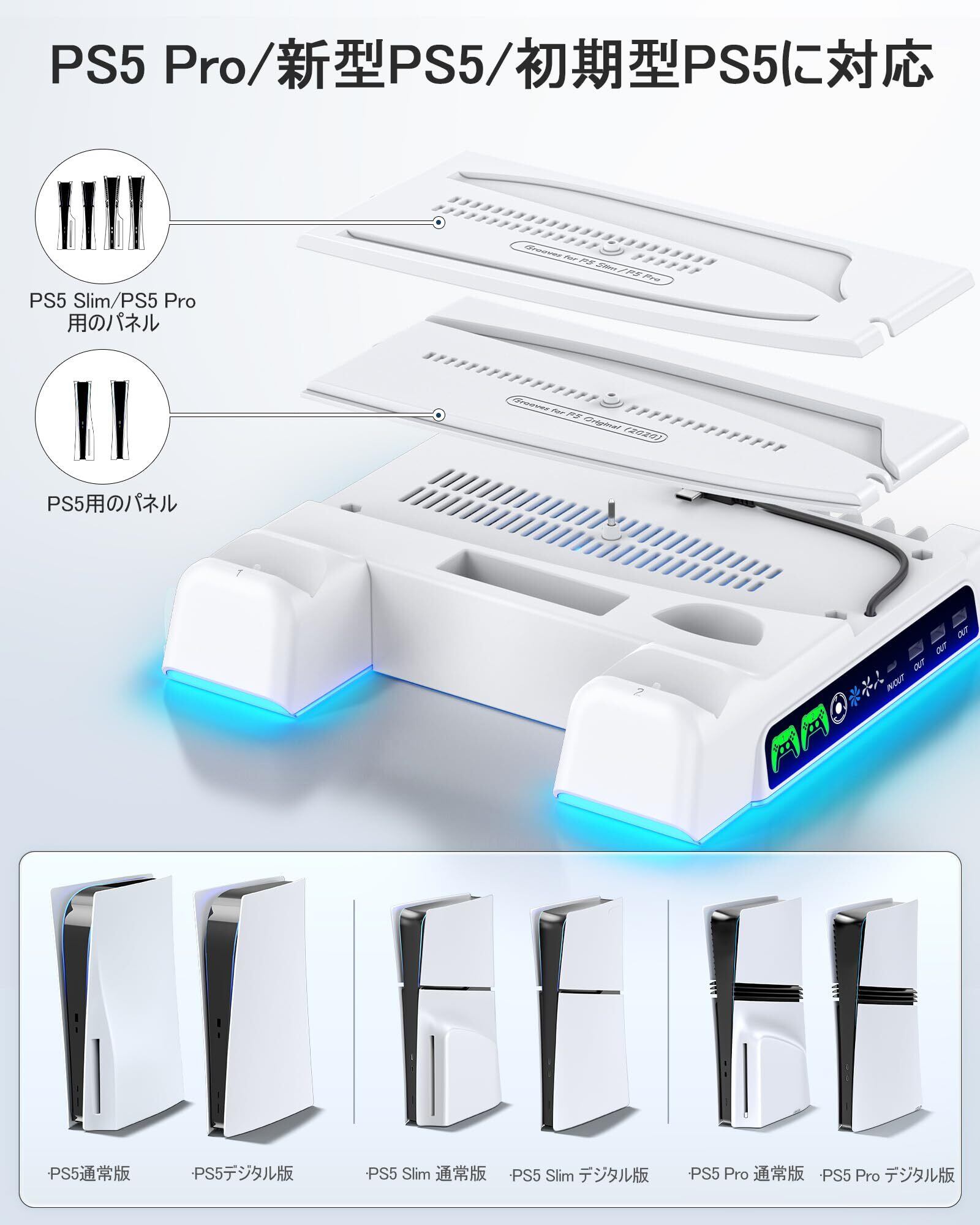 【PS5/PS5 Slim/PS5 Pro対応】PS5スタンドはPS5 Pro/新型PS5 Slimと初期型PS5の通常版とデジタル版両方に対応できます。PS5 SlimスタンドはPS5用のパネルとPS5 Pro/Slim用のパネルが付属され、PS5本体機種に合わせて2種類取り付けパネルから選択して使用できます。純正PS5コントローラーまたはPS5 Eedgeコントローラーを2台同時に充電できます。