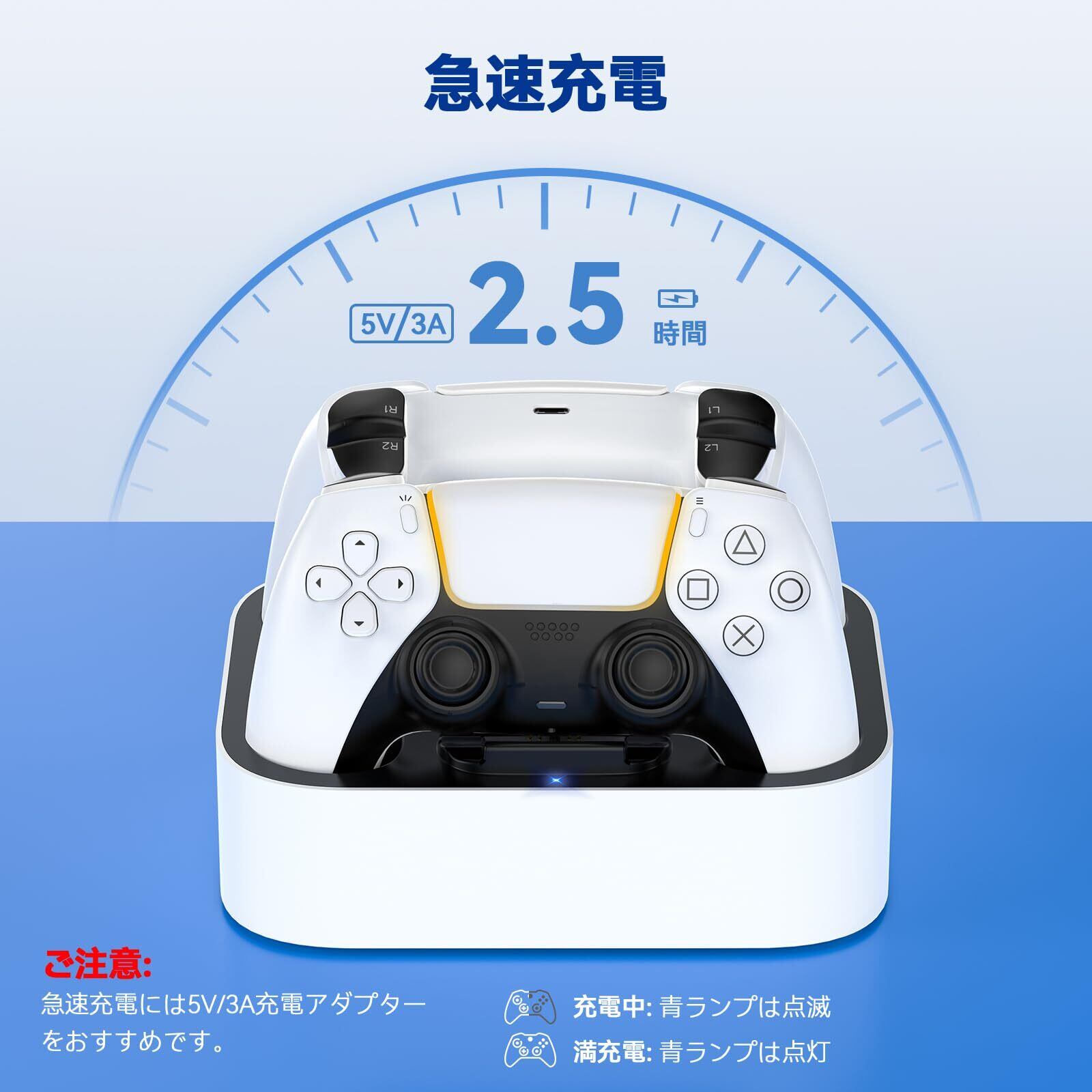 【急速充電】このps5 コントローラー 充電スタンドは、2台のPS5コントローラーを同時に充電できます。 5V / 3A電源を使用して、2台を3時間以内に、1台を約1.5時間フル充電できます。充電時間を節約して、ゲームタイムをもっと楽しめます。 (ご注意:急速充電には5V / 3A電源を使用してください。アダプターはパッケージに含まれていません)