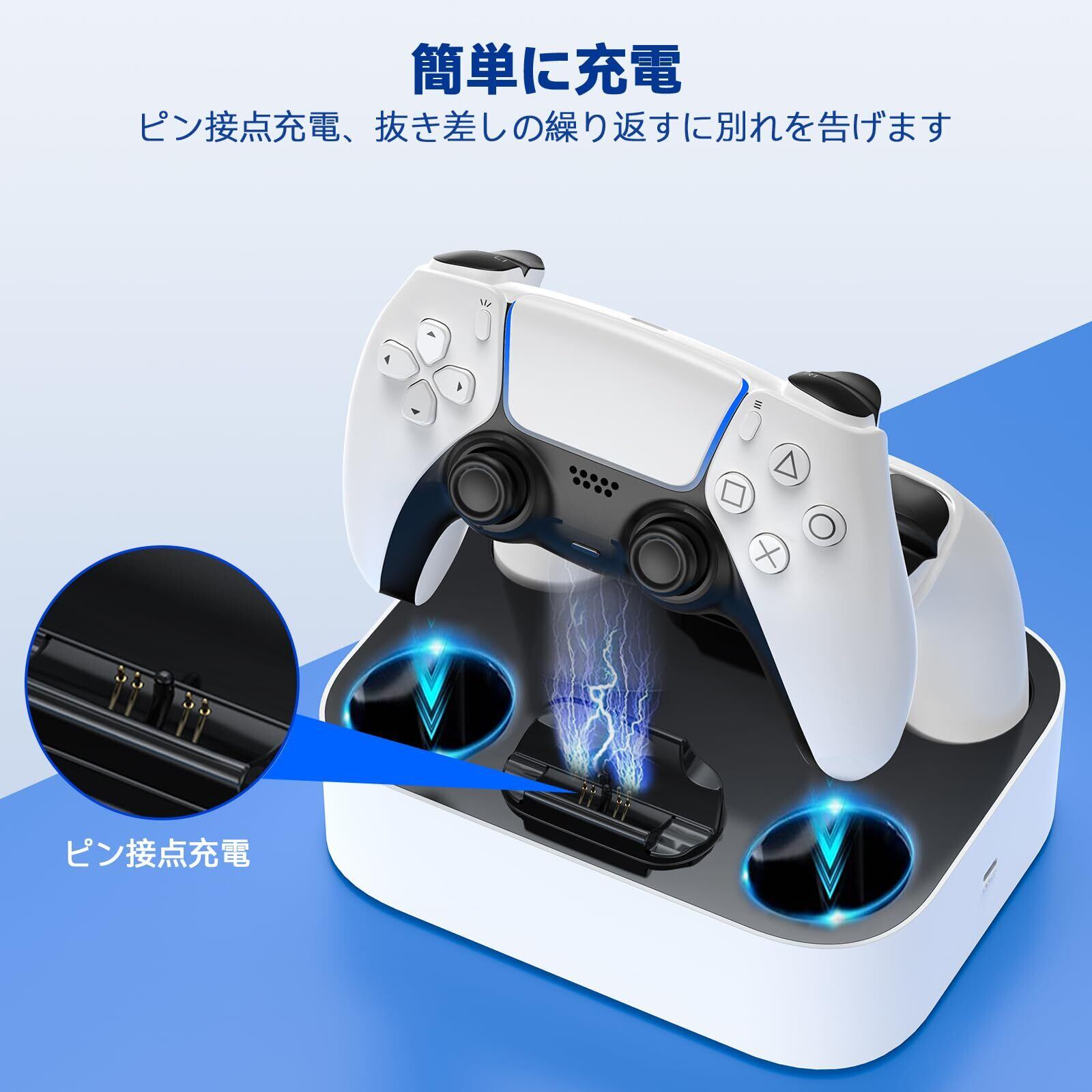 【置くだけで充電】差し込む溝のデザイン&ポゴピン充電接点デザイン。PS5 コントローラーを任意の角度での溝に置くだけで、充電器の接点ばねに完全に自動校正されます。充電位置を手動で調整する必要ないし、ゲームパッドポートに差し込むの繰り返しに別れを告げて、純正よりも充電は便利でもっとやすくなります。
