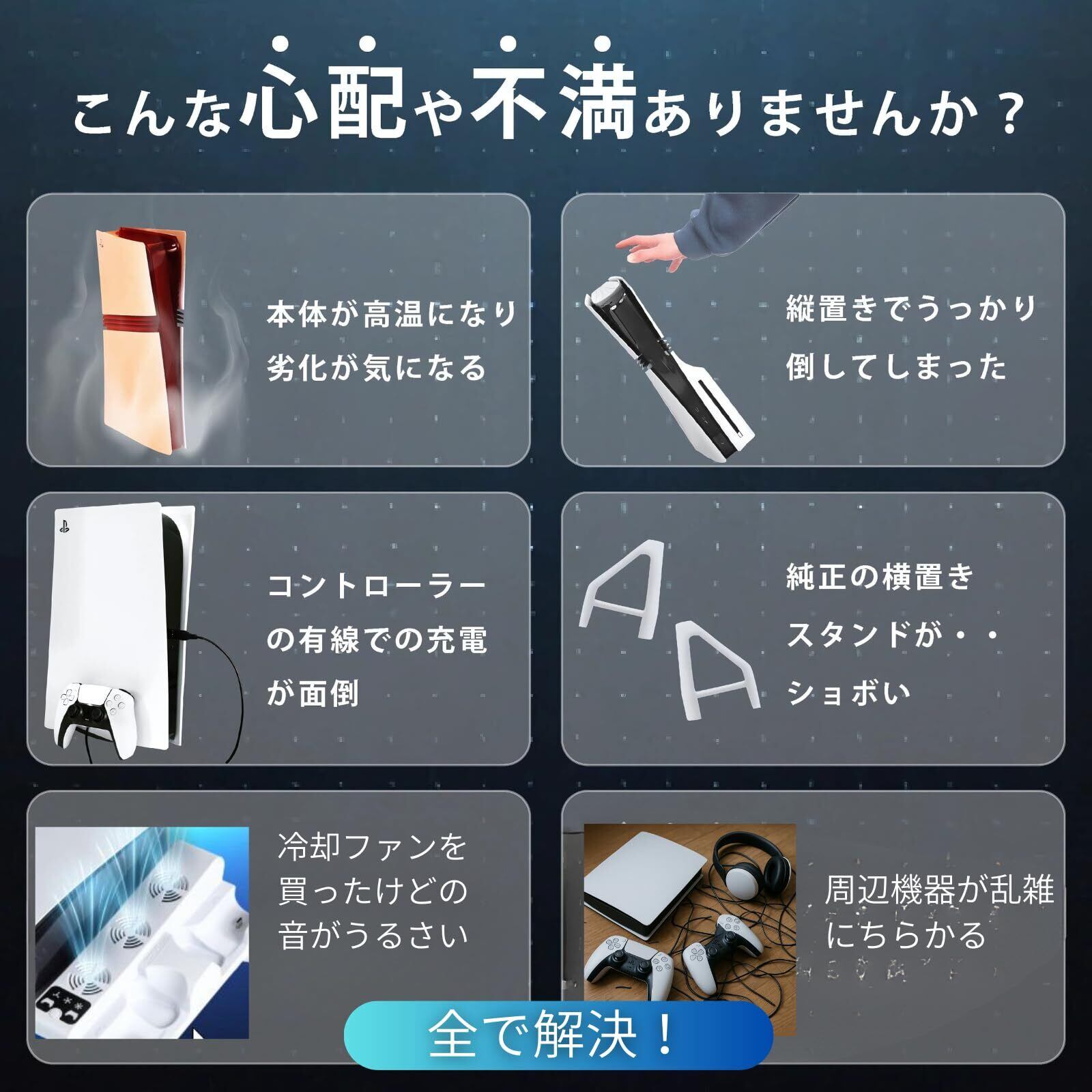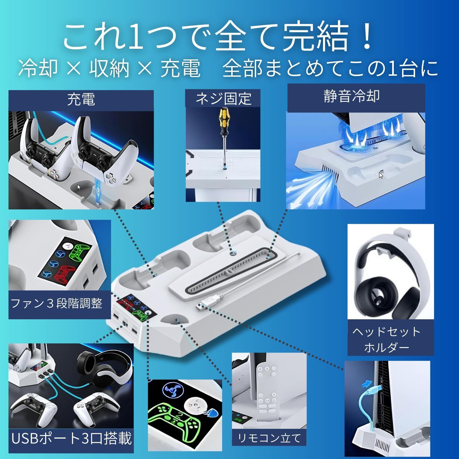 【冷却・充電・収納がこれ1台で完結】 ATURIKA製PS5縦置きスタンドは、PS5 Pro・PS5・PS5 Slim(ディスク版/デジタル版)すべてのモデルに対応。 高回転ファンによる3段階風速冷却、コントローラー2台+USB機器同時充電、さらにヘッドセットやリモコンもまとめて収納可能な多機能スタンドです。