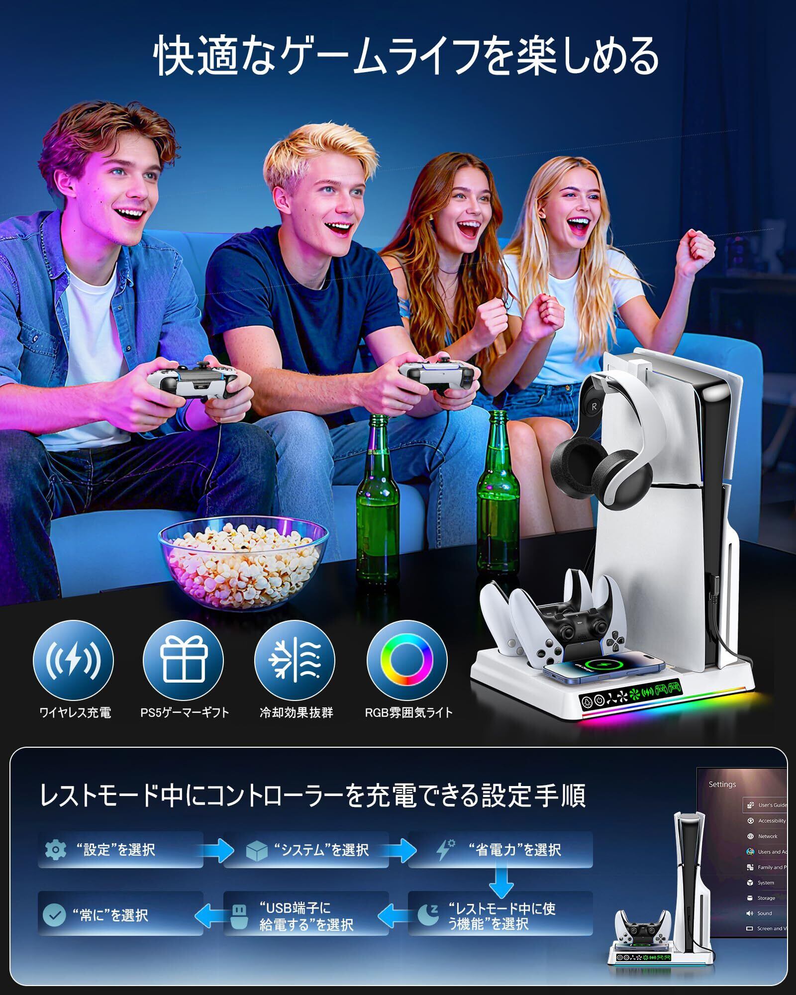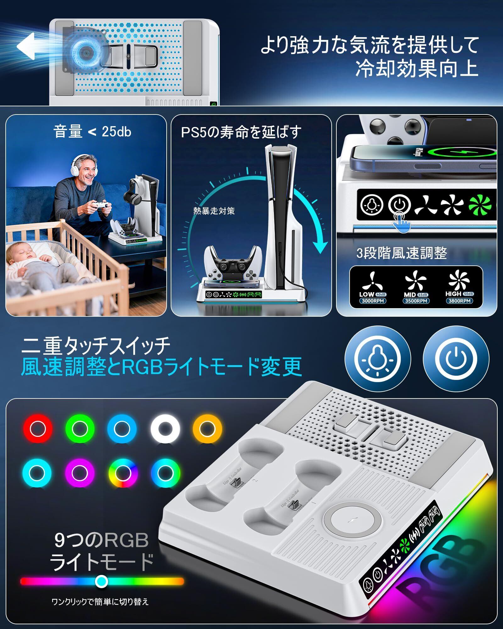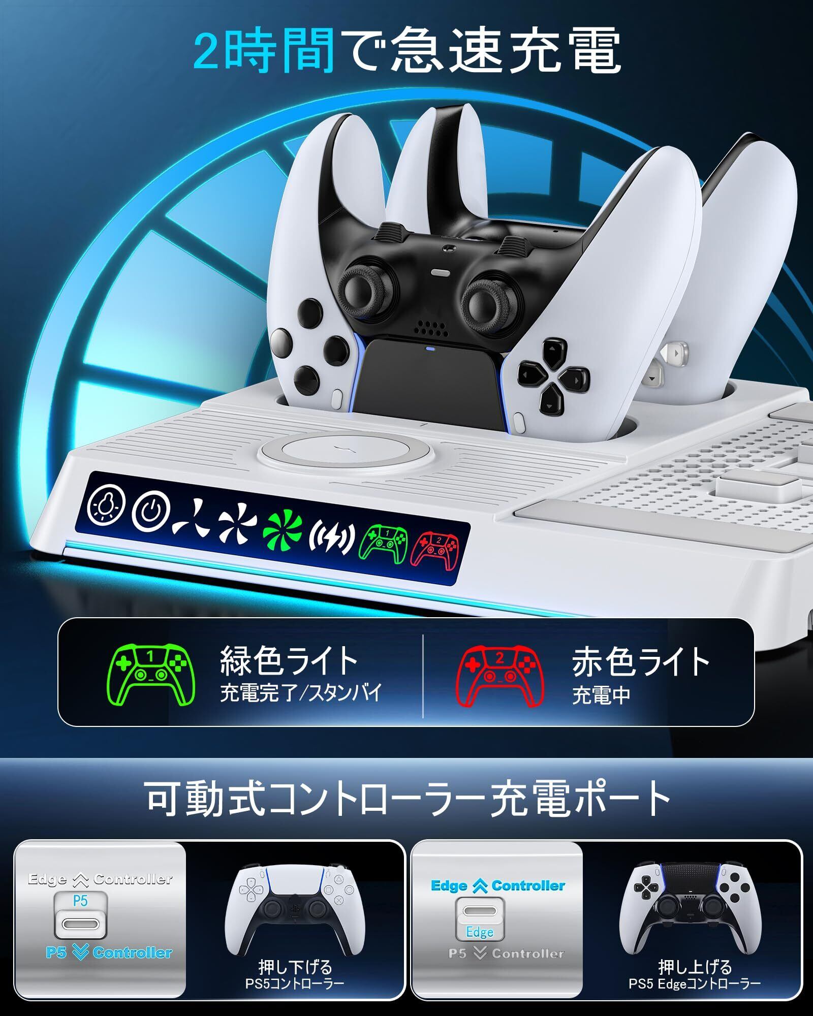 PS5 Slim 縦置き 冷却 スタンド 3段階風速調整可能 2台PS5 コントローラー 充電器 ワイヤレス急速充電 RGBライト付 USB-A/USB-Cケーブル内蔵 プレステ5 周辺機器 PS5/PS5 Slim/PS5 Pro対応