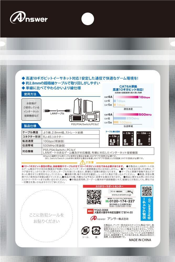 【新着商品】アンサー PS5/PS4/PS3/Switch/PC用 10ギガビットLANケーブル 5m【高速通信/超極細/スリムケーブル/快適オンライン/つめ折れ防止カバー】