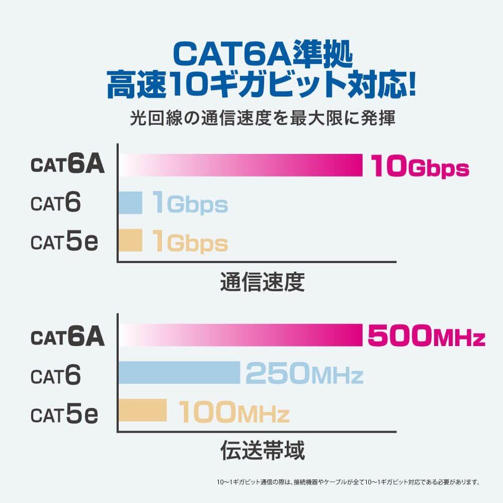 CAT 6の2倍のCAT 6A準拠の伝送帯域と10Gbps(10BASE-T、100BASE-TX、1000BASE-T、1000BASE-TX、10GBASE-T)に対応しており、より早くより多くのデータ転送が可能です。