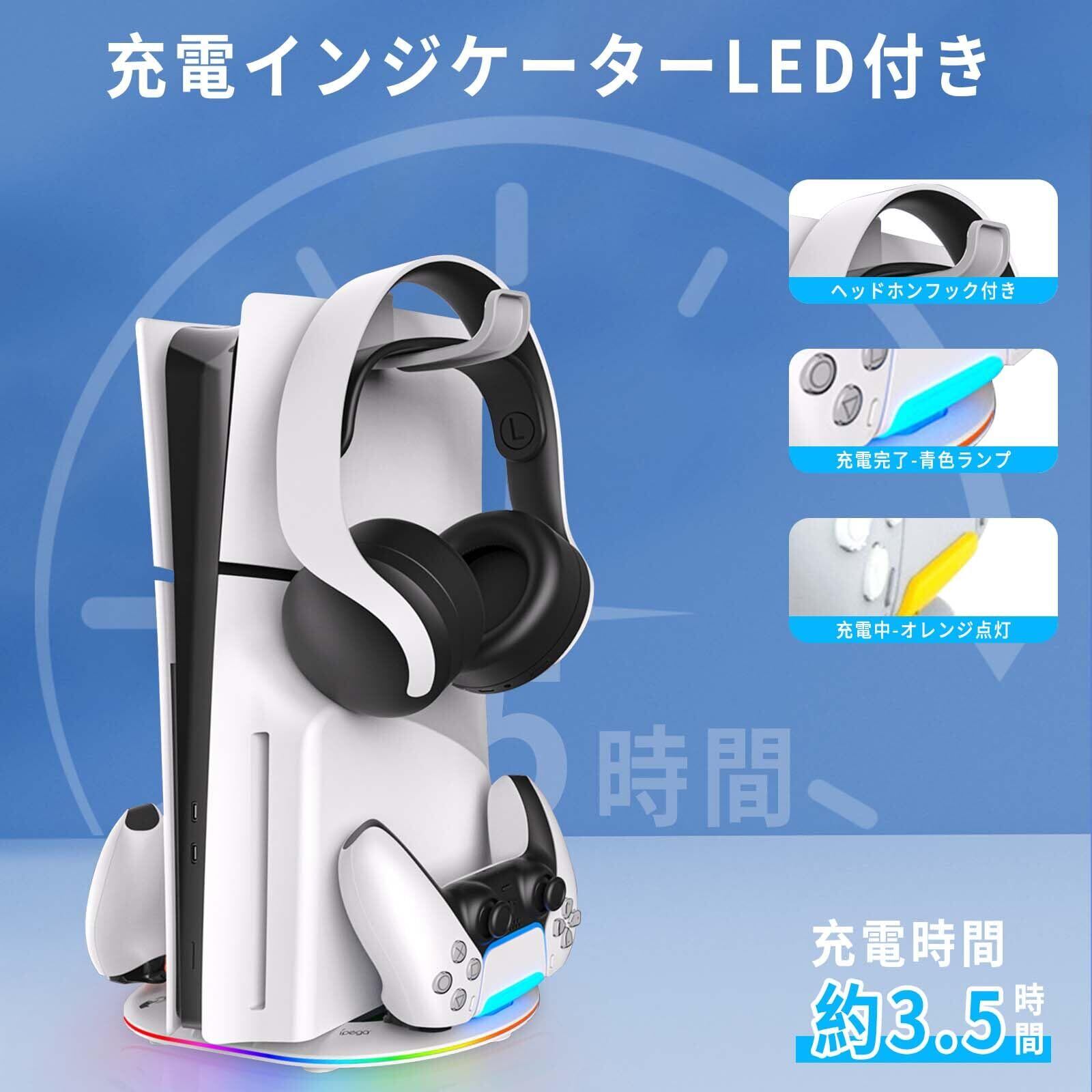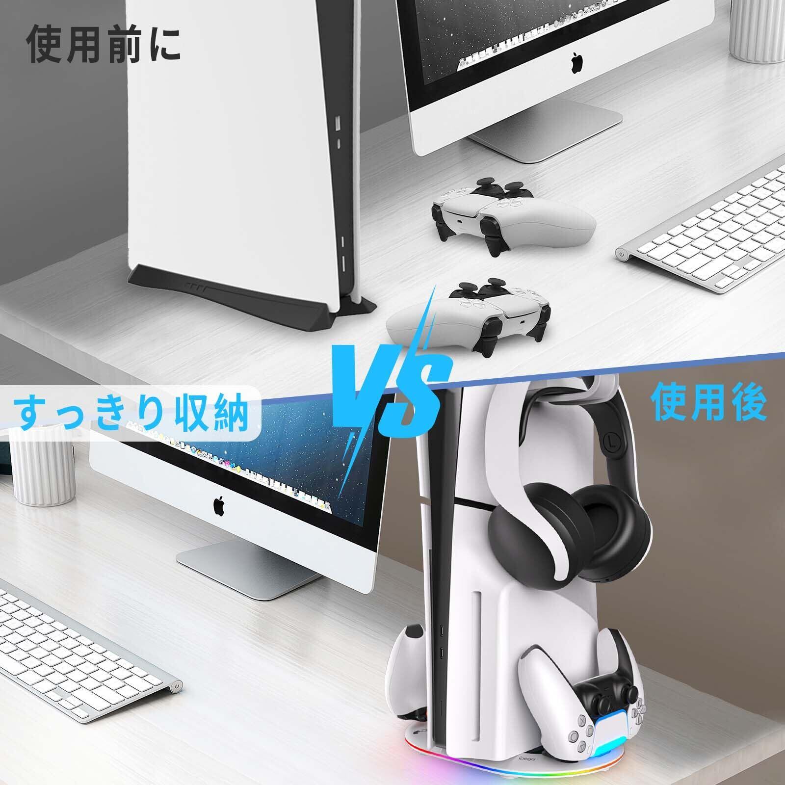 PS5 Slim/PS5 Pro 対応 縦置きスタンド PS5 用スタンド PS5 スリム/PS5 Pro 用コントローラー 充電器 PhyiFlbey 2台同時充電 多機能 収納 ヘッドホンフック付き RGBライト効果付き& 過充電防止 PS5 Slimホスト光学ドライブバージョンとデジタルバージョン対応 PS5 周辺機器