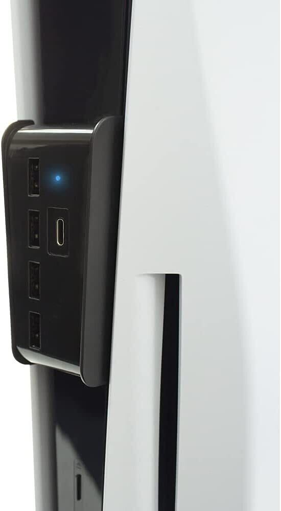 PS5本体に挿し込むだけで、USBポートを5つへ増設できます。 (※USB TYPE-Aポート 4つ、TYPE-Cポート 1つです。) 充電・通信接続が可能。給電はバスパワータイプで別途電源を用意する必要はありません。