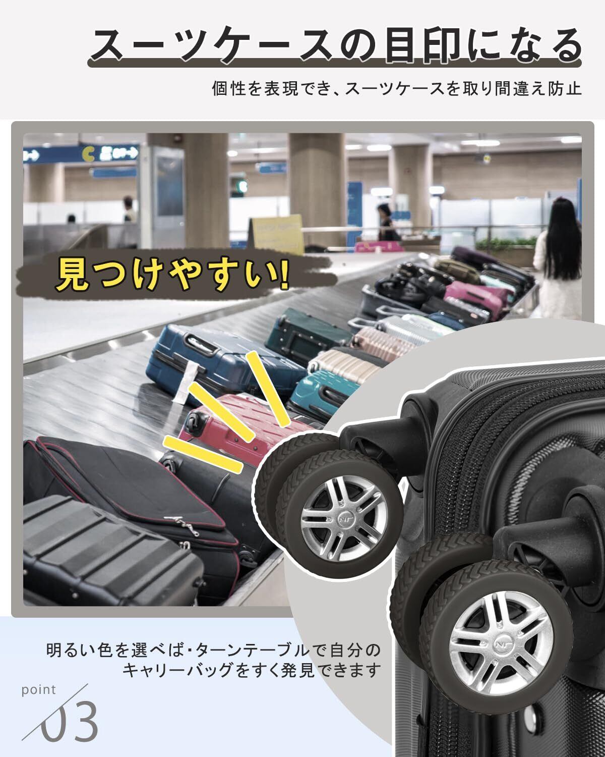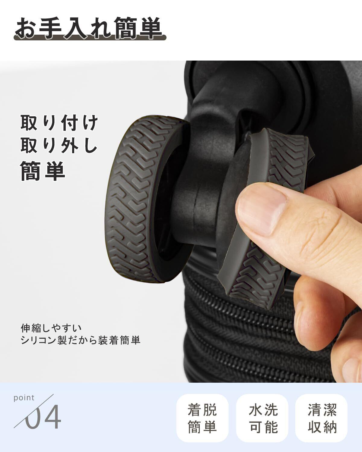 【ぴったりサイズでキャスター保護、寿命延長】市販のスーツケース用ホイールカバーは通常1サイズのみで、キャスターのサイズに完璧に合わないため、カバーが外れやすいという問題があります。当社のキャスターカバーは5cm、5.5cmと6cmの3種類サイズを用意しています。適切なサイズを選ぶことでホイールを効果的に保護し、摩耗を減らし、スーツケースの寿命を延ばせます。さらに、広いカバー面積でキャスターをしっかり包み込み、脱落や汚れ、ダメージも防ぎます。