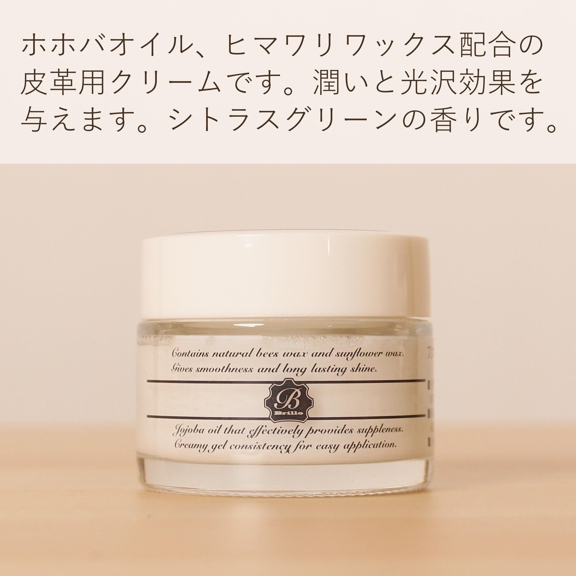 ●天然ワックスの「ビーズワックス(蜜蝋)」と「ヒマワリワックス」が、皮革表面に硬く透明な膜を作ることで持続性のある光沢と滑らかな感触を与えます。