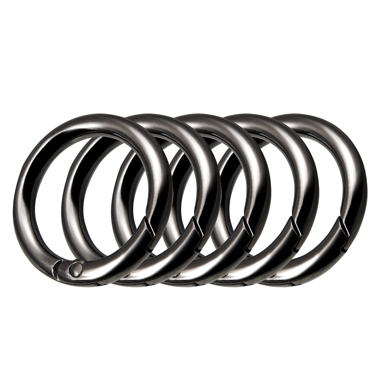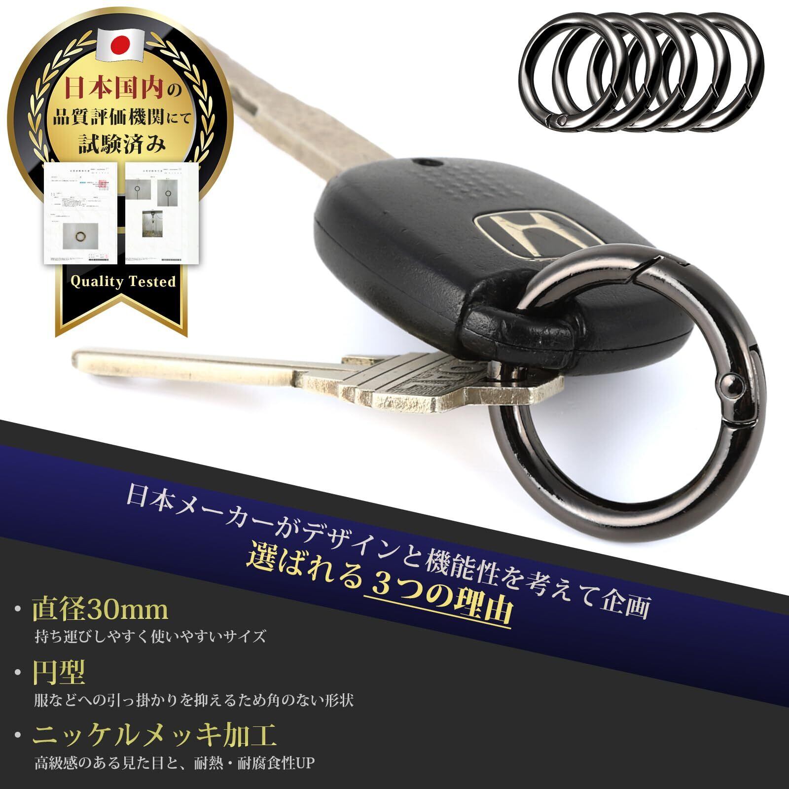 【オシャレな鞄等にも馴染むカラビナ】 外形:約30mm、内径:約22mm、幅(線経):約4mm、重量約6g(1個あたり)というコンパクトさと、角のない円形だから高級バッグなどに装着しても悪目立ちせず、もともと付いているパーツのように溶け込みます。耐久性に優れた亜鉛合金にニッケルメッキ加工を施し、ブラック仕上げによって光沢感と耐食性を両立。落ち着きのある高級感を演出しています。(ニッケルメッキ加工とは:光沢や耐食性、耐熱性に優れており、腕時計やメンズ小物にも使われる仕上げ技術です)
