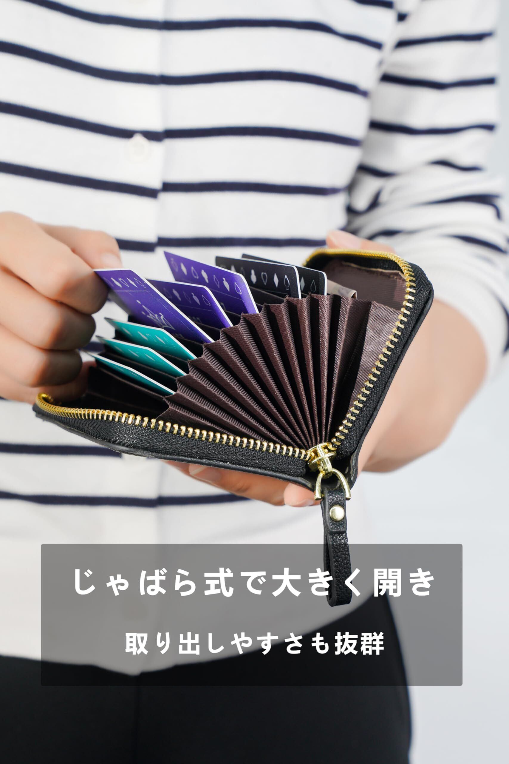 【大容量 で使いやすい ジャバラ 式】最大180度開くじゃばら式で、カードが一目で見やすく取り出しやすい。9つのカードポケットと2つのワイドポケットで最大22枚収納可能。大きく開いて見やすく、取り出しやすい。