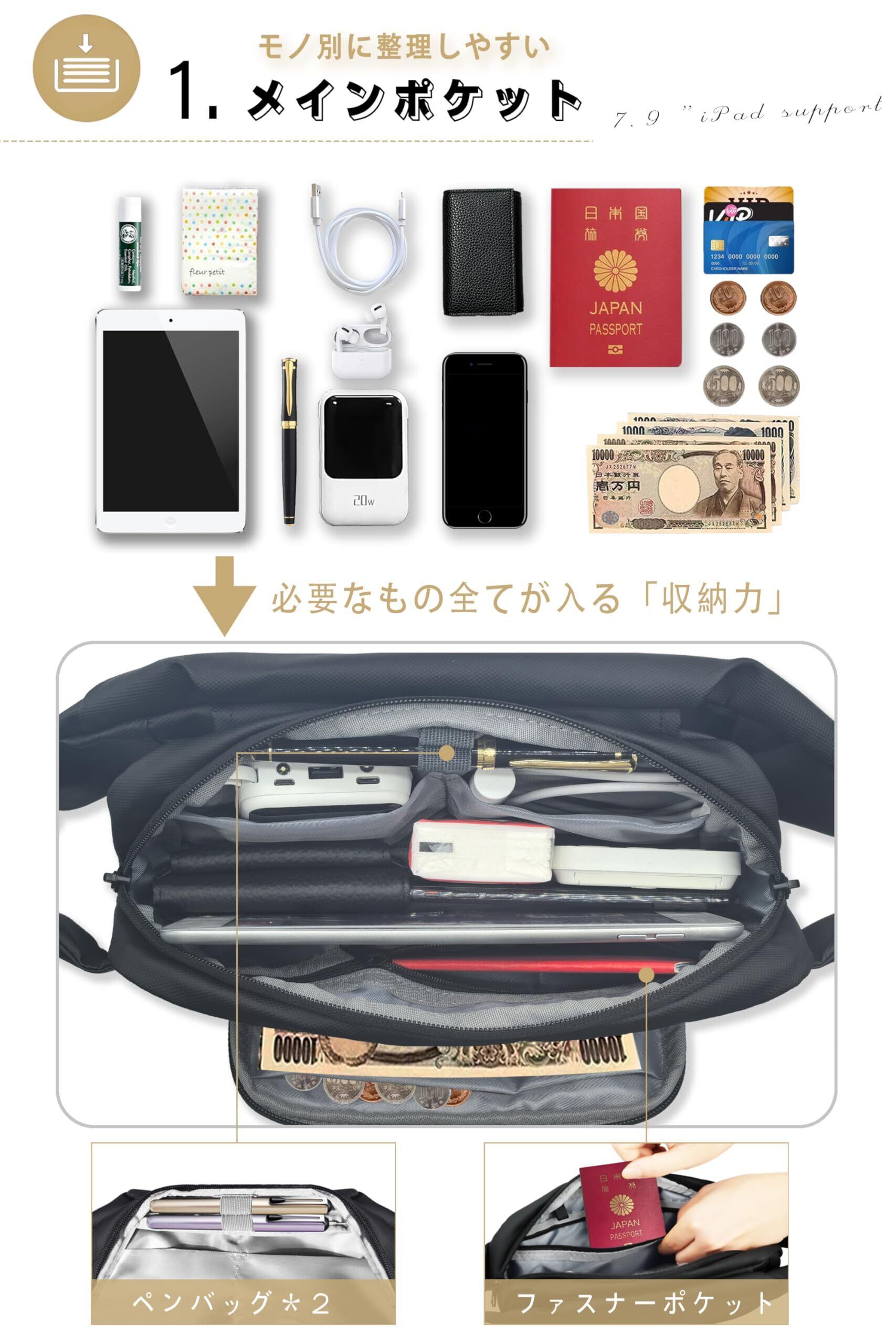 【分類収納】ショルダーバッグは収納物を4つのゾーン&10つのポケットに分けることができ。肩掛けバッグ前面の隠しポケット、防水傘と水筒ポケット、スキミング防止バックポケット。また、メイン収納はガバッと大きく開閉でき、整頓しやすい小分けポケットと筆ポケットを完備。内側はキーストラップを装備。