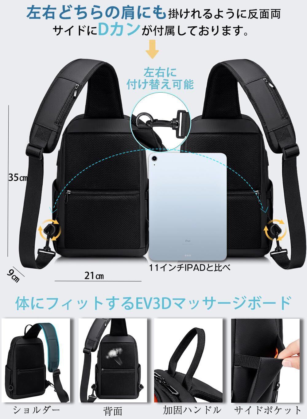 【ボディバッグ仕様】:サイズ:縦35cm×横21cm×マチ9cm。重量:約 0.56kg。ポケットの数 :11。素材:オックスフォード。対応できるタブレットサイズ:最大11インチ。『都会を軽快に歩く』『近場に旅行する』『たまの海外旅行』全てに持っていけるバッグに必要な条件は、携帯電話/ipad/財布/充電ケーブル/モバイル電源などのアイテムがスマートに収納できること。そして「軽量」「形」「収納性の良い」ショルダーバッグ。