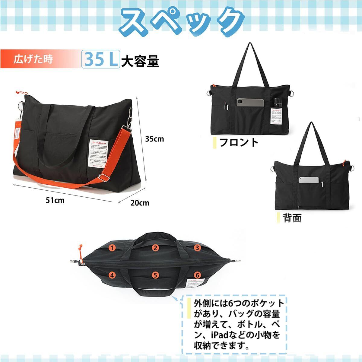 【便利な多ポケットデザイン】外付けの6つのポケットがあり、コップ、傘、イヤホンなどの小さい物を置くことができ、取り出しやすい。 パスポートなどのパスケースも内蔵。
