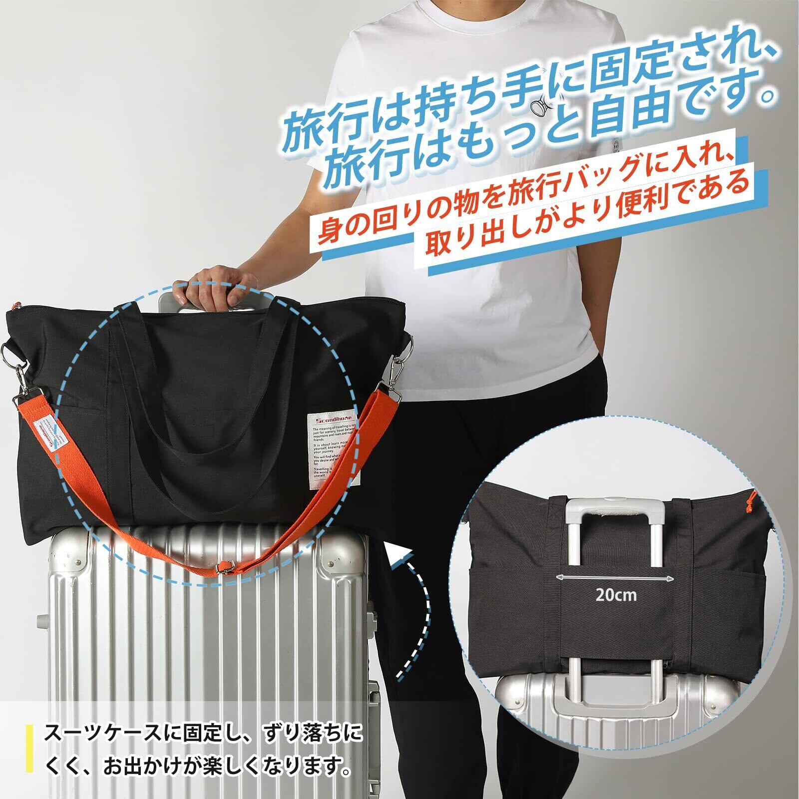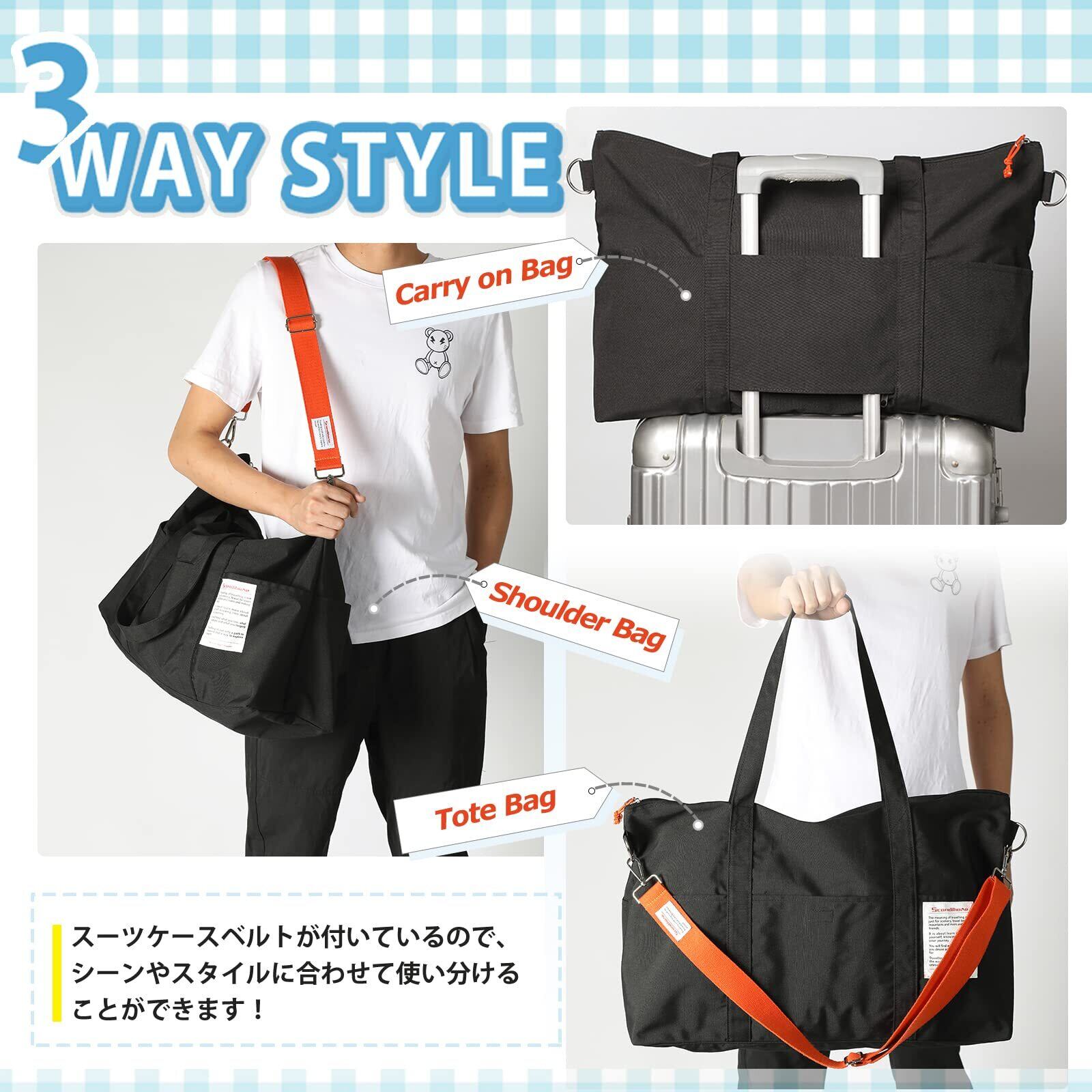 【3wayの使い方】おしゃれなキャリーバッグはスーツケースの上に置いて移動、バイカラーのショルダーストラップはショルダーバッグとして、トートバッグとしてもお使いいただけます。 ジム、ショッピングなど普段使いはもちろん、男女問わず幅広く使えるライトバッグです。