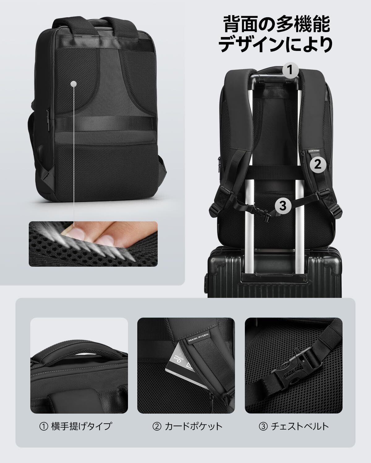 ▶【通気性】背面、ストラップ裏面はクッション材の上にメッシュ素材を使用しており、肩や背中への負担を軽減しながら、通気性に優れています。チェストベルトが装備されており、より身体にフィットする安心設計です。背面部分はスーツケースとセットアップができる構造になっており、持ち歩く便利で、出張や旅行など幅広く使用できます。特にサラリーマンの出勤は最適です。