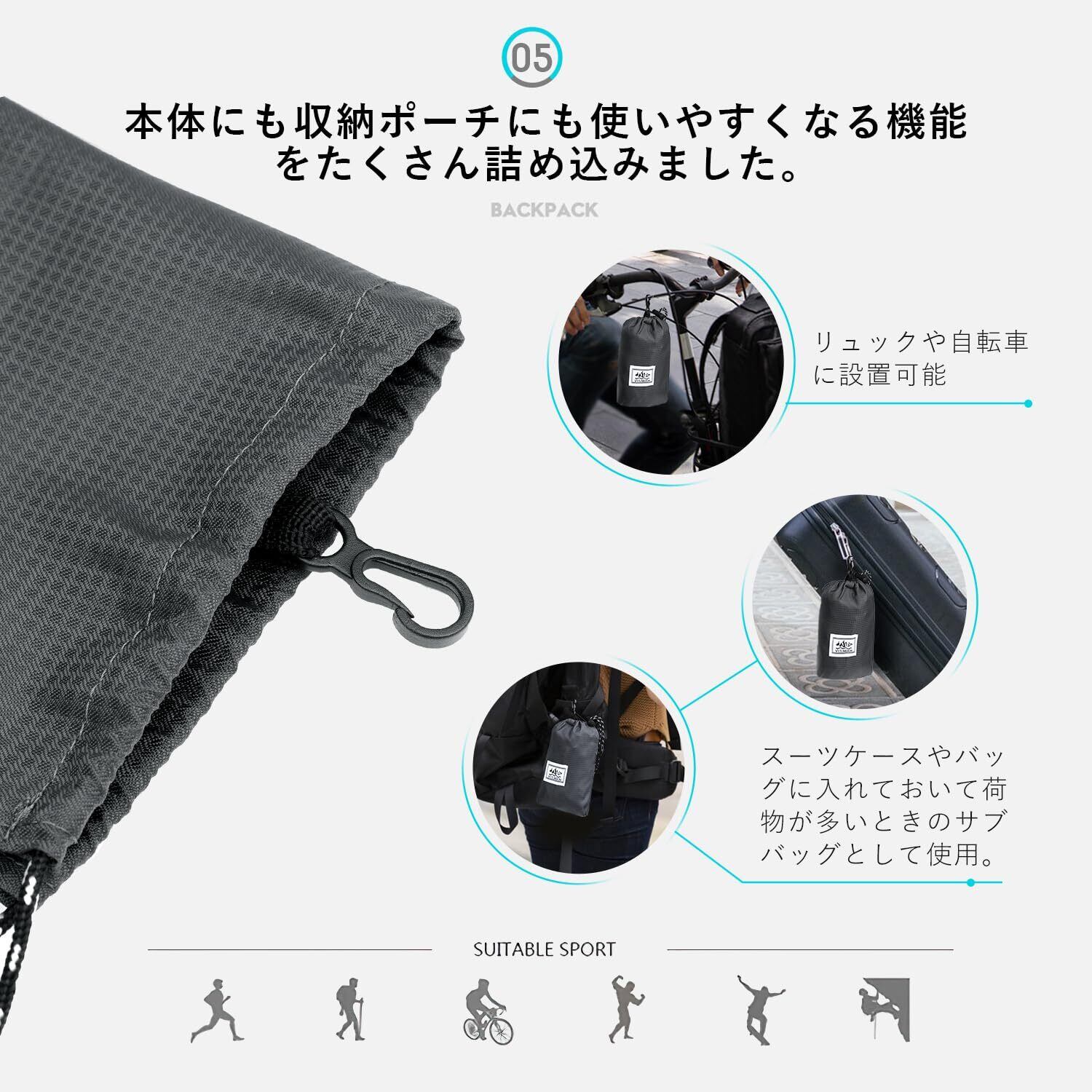 【軽量で引き裂きに強い、豊富な機能を搭載】軽い:163g サイズ:(約)縦19cm*横10cm*厚さ9cm 内部のスペースが広いので、エコバッグとして買い物ショッピング軽便軽量なんでも入れられる。ショルダー長さ調節可能、背負うと130センチの子供と175センチの大人でも紐で調節して背負える。メイン収納は、ダブルファスナーが大きく開いて出し入れしやすい、内ポケットも小物が収納できて便利、フロントポケット1個、500mlペットボルトも入って使いやすいサイドポケット2個、付属の収納袋1個。