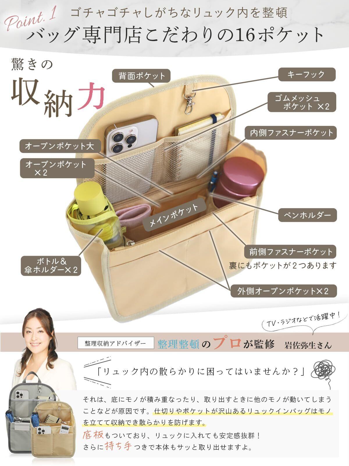 【16ポケット構造で徹底整理|収納のプロ監修】 累計2万個以上の販売実績を持つバッグインバッグシリーズから、待望のリュック対応モデルが登場。大小さまざまな16のポケットを備え、収納力と取り出しやすさを両立。A4サイズが入るLサイズと、B5対応のMサイズをご用意しています。