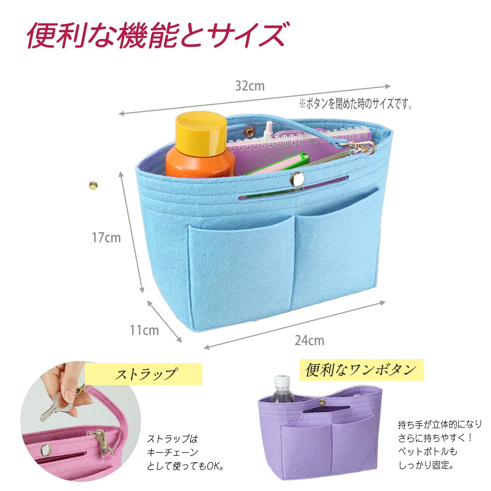 【ストラップ・ボタン付きで移し替えもラクラク】 バッグインバッグ フェルト 軽量タイプ。ショルダーストラップ付きで取り外し可能。鍵やパスケースを付けて便利に使えます。バッグを変えるときも、ストラップを持って中身ごと移動できて時短に。中央にはペットボトル対応のボタン付きで、荷崩れも防止。 収納や整理の専門家監修のもと、日々の使いやすさを重視して仕上げています。 フェルト素材のストラップと柔軟な底板が付属。フェルトストラップの代わりに使える、おしゃれなパールストラップ付きタイプもお選びいただけます。