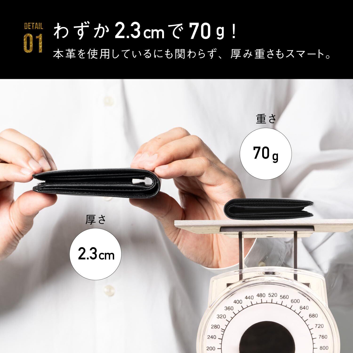 【わずか70gの圧倒的な軽さ】本革を使用にも関わらず、70gという圧倒的な軽さです。パンツのポケットに入れていても所持していることを忘れるほどの軽さです。パンツだけでなく胸ポケットに入れても気になりにくく身軽に動きやすい人にもオススメです。