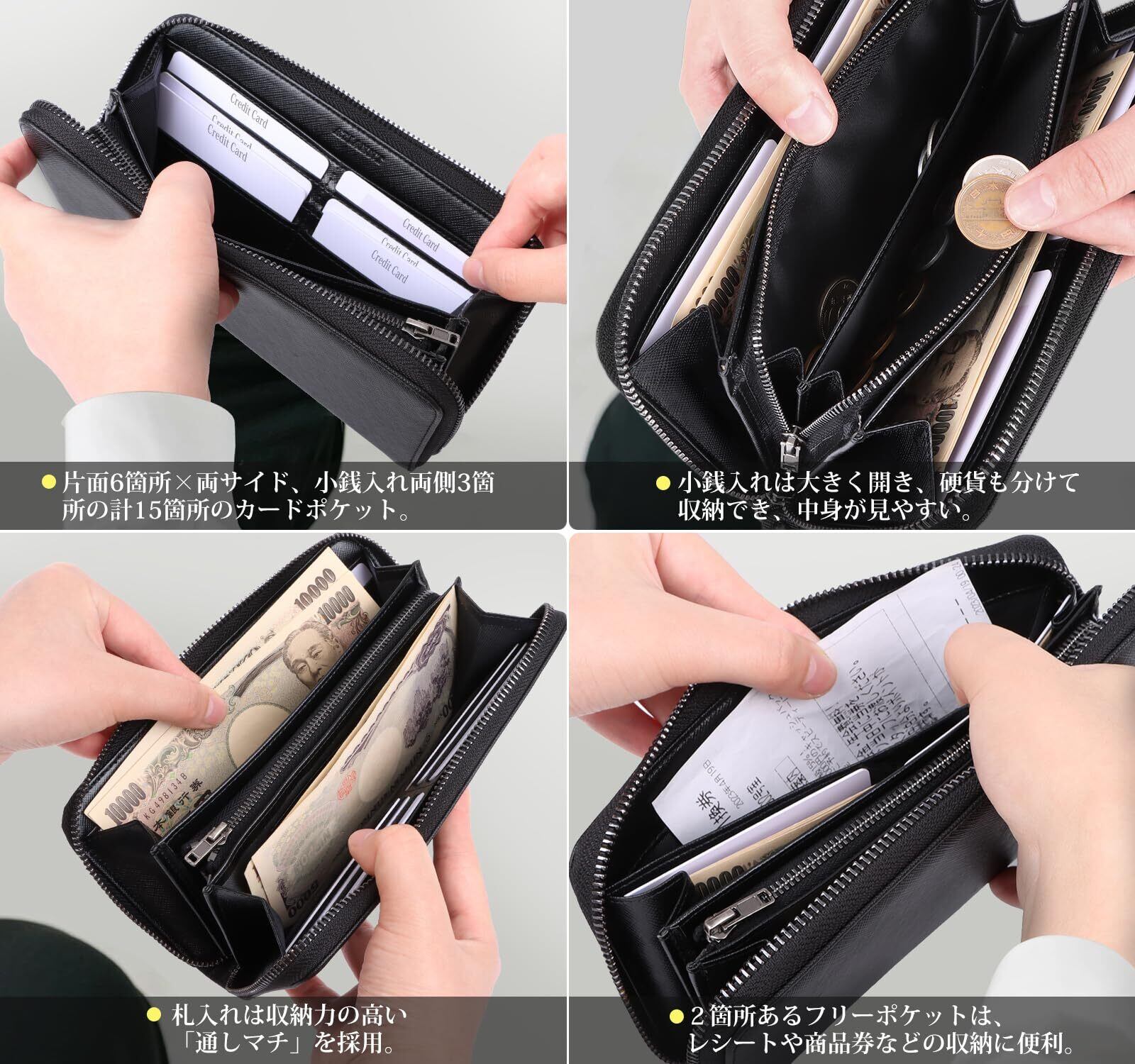 【大容量で使いやすい】ラウンドファスナの長財布で蛇腹に開くため、お札を分けたり、レシートを分けたりと細かく収納することができます。カード入れは片側6枚づつ収納可能で、小銭入れの横側にも3箇所あり、合計15枚のカードが収納できます。カード入れの背面にはそれぞれフリーポケットを備えています。また、小銭入れはL字型ファスナーを採用しており、大きく開き、内部を2室に仕切ったセパレート型で、日本円の硬貨を分けて入れることができ、会計の時はスマートで、使い勝手が抜群です。
