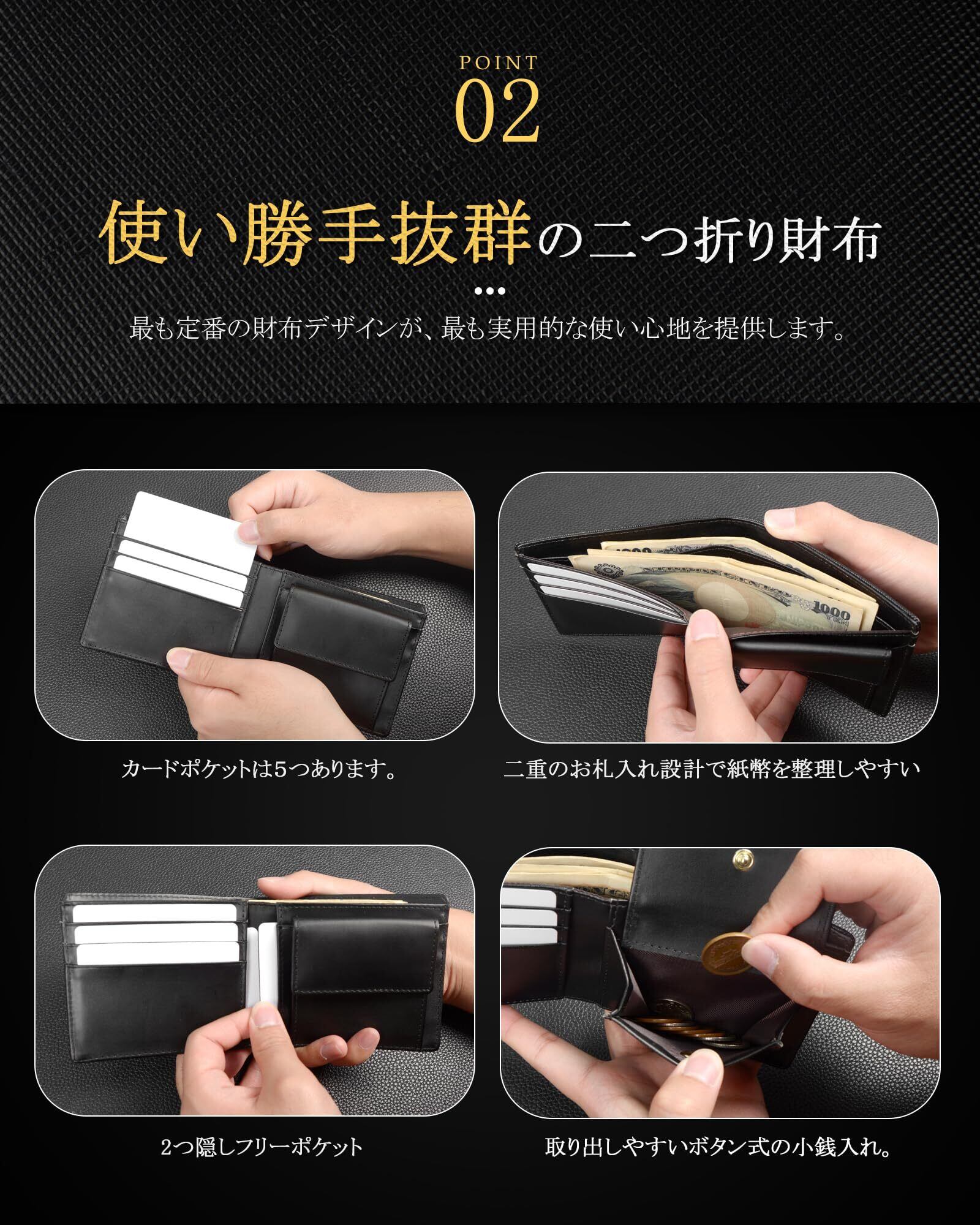 【こだわりの使いやすさ】小銭入れが大きく開き、内容物が見やすく取り出しやすい設計になっており、日常使いにも便利な2つ折り財布 メンズです。メンズ財布にはカードポケットが3つ、お札入れが2つ、隠しポケットが4つあり、薄型ながらも必要な収納力をしっかりと確保しています。