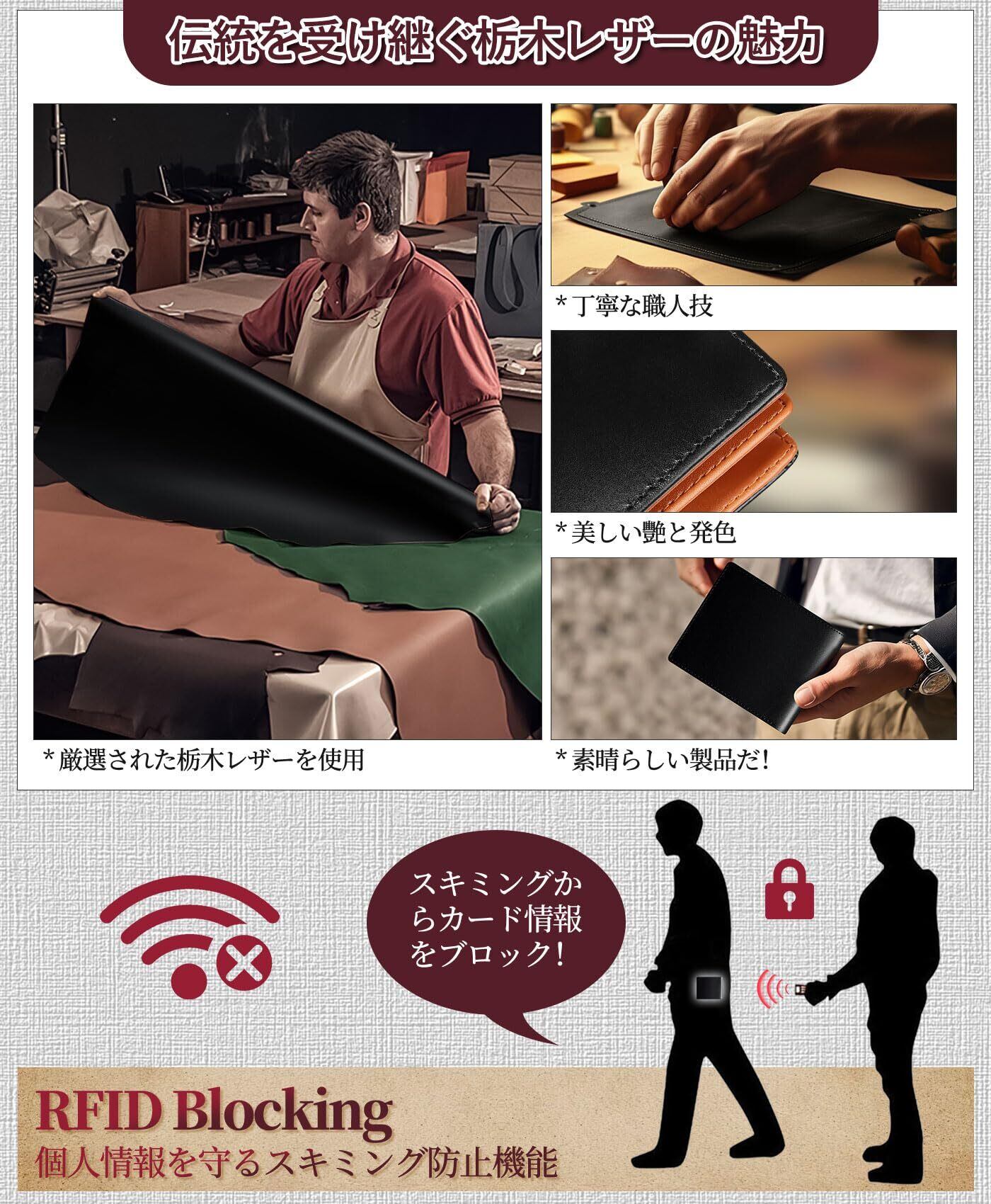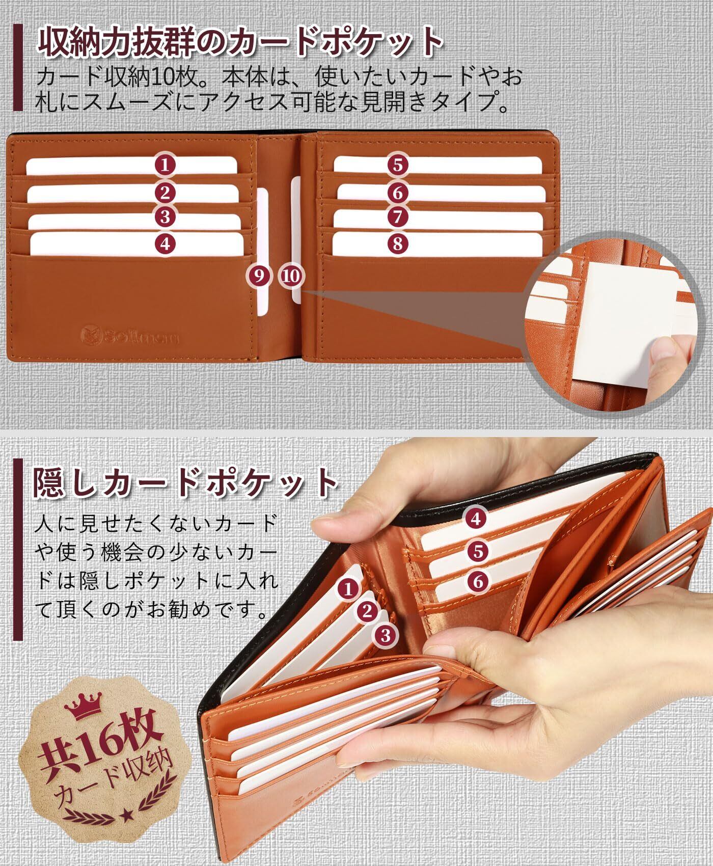 【財布仕様】◆サイズ :横幅11.8cm×縦幅9.7cm×厚み1.8cm、重さ99g ◆収納力:カード16枚収納(隠しカードポケット×6)、札入れ ×2、ボックス型小銭入れ×1、スキミング防止機能搭載(RFID Blocking)◆カラー:ブラック/ブラウン/グリーン/ブラック(内側ブラック)/ブルー/ダークブラウン