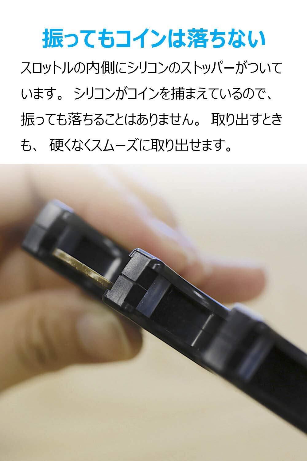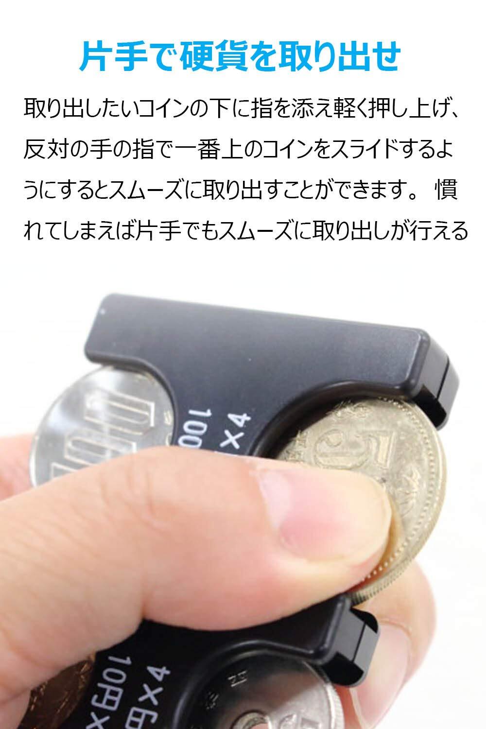 片手で硬貨を取り出せ:取り出したいコインの下に指を添え軽く押し上げ、反対の手の指で一番上のコインをスライドするようにするとスムーズに取り出せます。慣れてしまえば片手でもスムーズに取り出しが行えます。