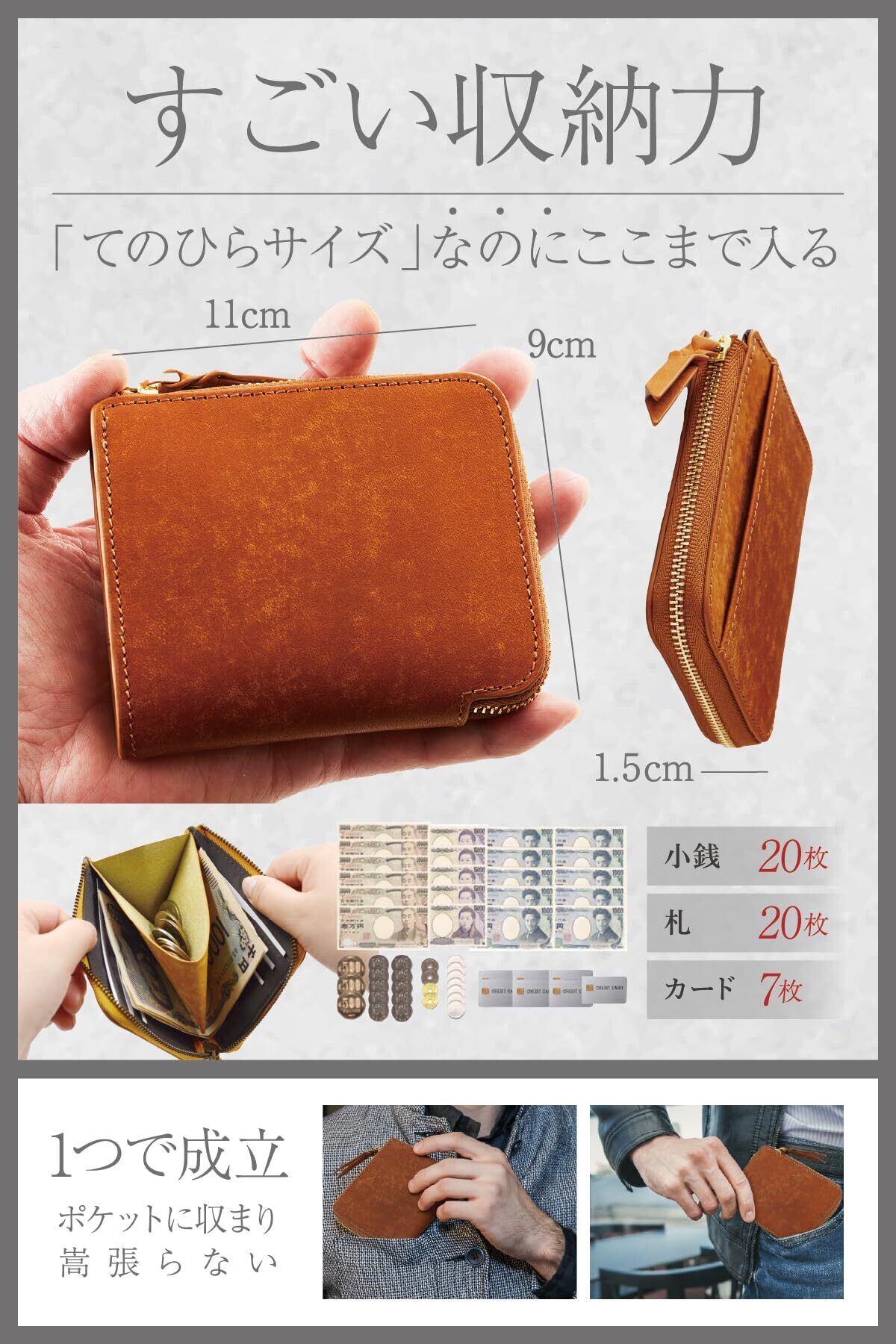 【仕様・スペック】 ・サイズ:10.5*9*1.5cm 60g ・小銭20枚・札20枚・カード7枚収納 ・コインスペース:9×5cm ・外側ポケット×1 ・カラーバリエーション:グリーン、ブルー、ダークネイビー、キャメル