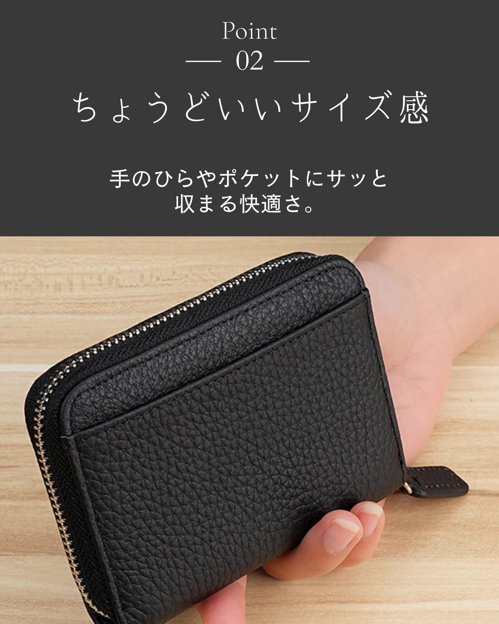 【コンパクト、なのに大容量】手のひらにすっぽり収まるサイズ感でありながら、カード、小銭、お札を無理なく収納できる大容量。旅行や出張、普段使いにも便利。スマートに持ち運べて、財布の中身がすぐに見つかる設計です。