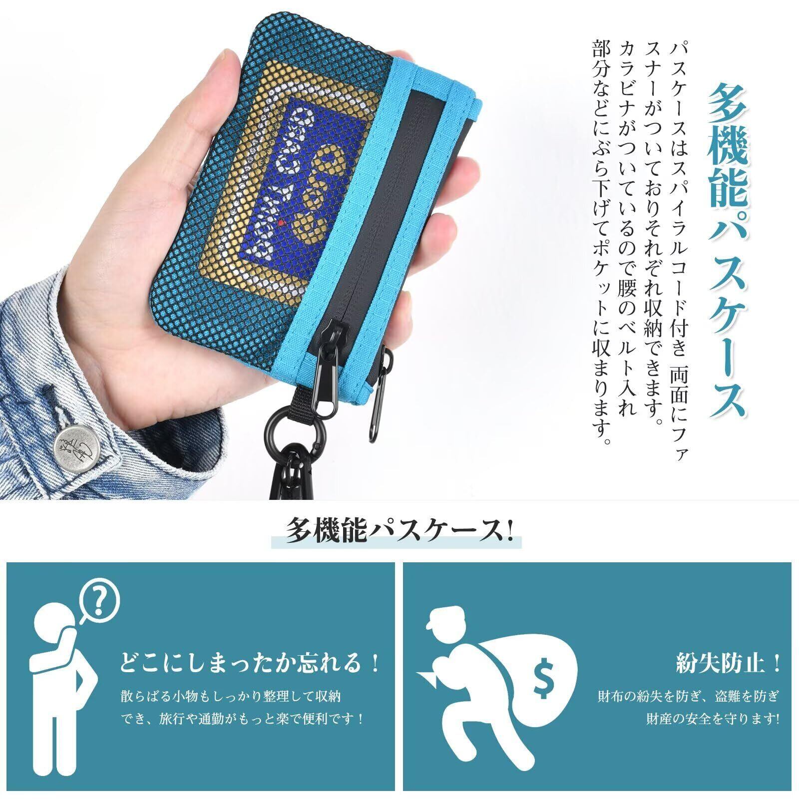 【多機能パスケース】パスケースはスパイラルコード付き 両面にファスナーがついておりそれぞれ収納できます。カラビナがついているので腰のベルト入れ部分などにぶら下げてポケットに収まります。 利用する際にパスケースをポケットから取出し手を伸ばすとスパイラルコードが伸びて即座に出し入れして使うことができます。