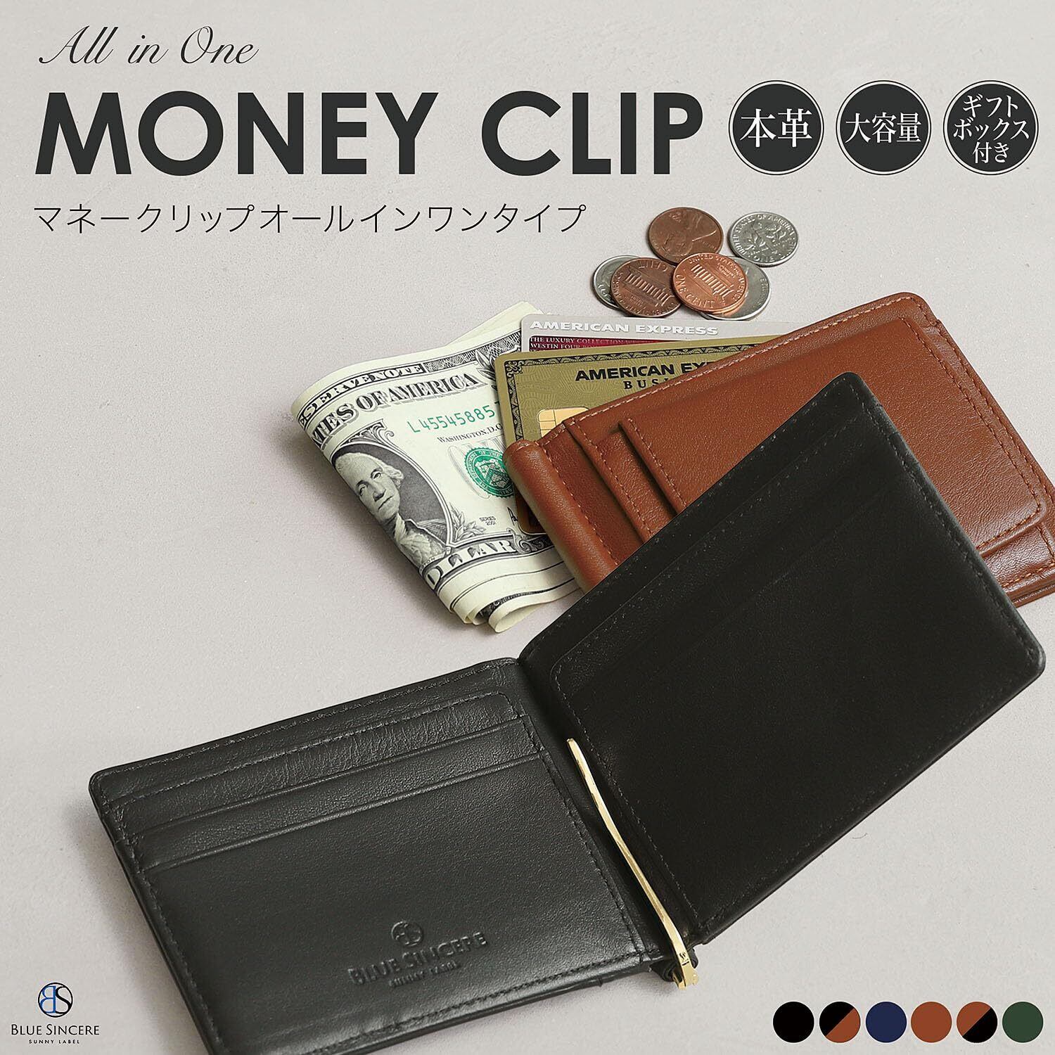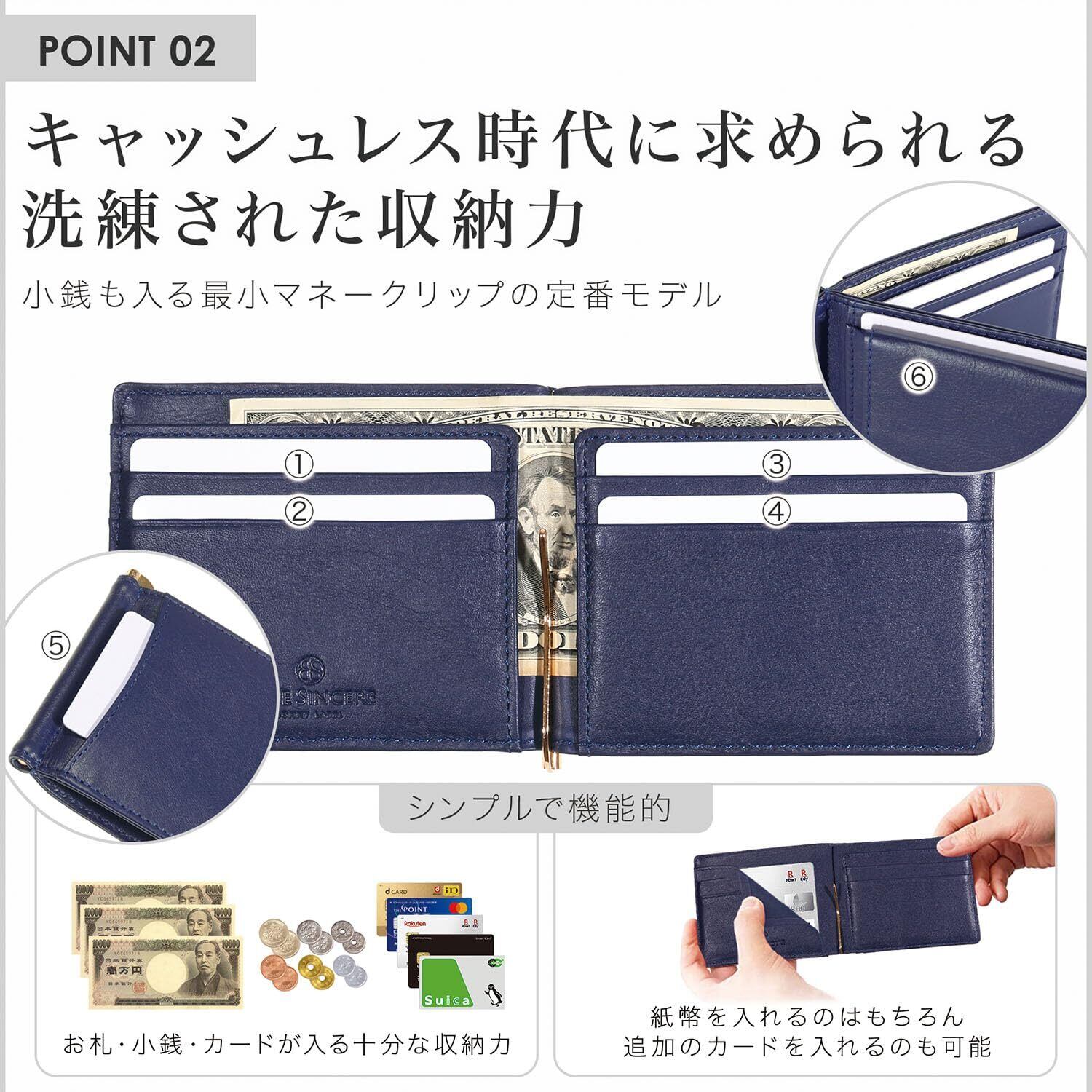【 全てを詰め込んだマネークリップ 】人気の高いボックスタイプの小銭入れを採用し、植物タンニン鞣しの本革100%のマネークリップ。 カード収納は外側ICカードポケットだけでなく隠しポケットも装備した合計6ポケット。 スマートなライフスタイルに憧れているけど、もしもの時の小銭収納が心配な方にうってつけの逸品です。 【 植物タンニン鞣し本革を採用 】 マネークリップ の素材はBLUE SINCERE オリジナルのプレミアムレザーを外側も内側も贅沢に100%採用。傷が目立ちにくく、タンニンなめし革だから色合いも美しい。それでいて、PUレザーや牛床革と違い経年変化を味わえます。落ち着いたデザインに仕上げているので、ビジネス、カジュアルどちらのシーンにもお使い頂けます。 【 支持率NO1 ボックス型小銭入れ 】BLUE SINCERE マネークリップは全ての小銭がパッと見えて、取り出しやすいボックス型小銭入れを採用。 レジ前での小銭の支払がモタつくことはありません。 【 求められたカード収納枚数 最大8枚 】内側4枚、外側2枚(同じポケットに2枚ずつ最大4枚)が収納可能。お札も、小銭も、カードもバランスよく収納できるので、今の時代まさに求められたデザイン。