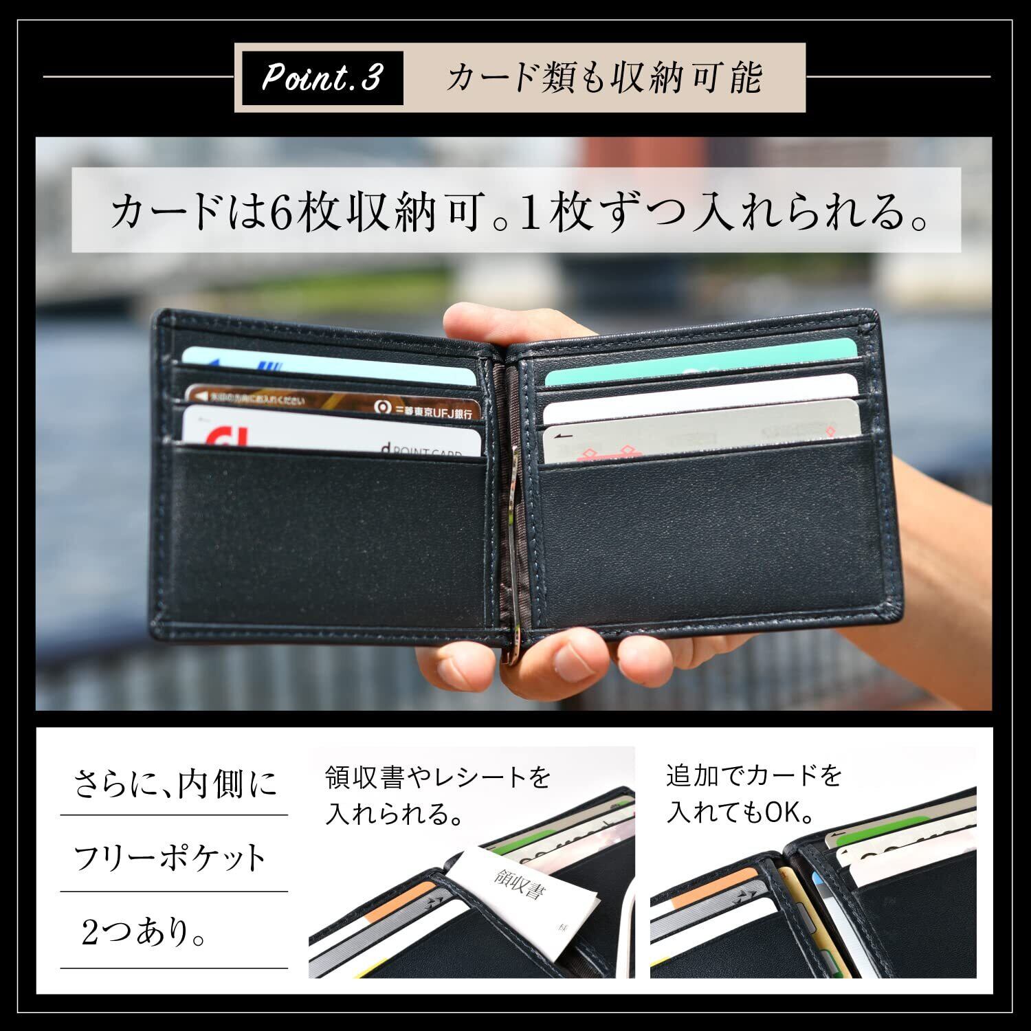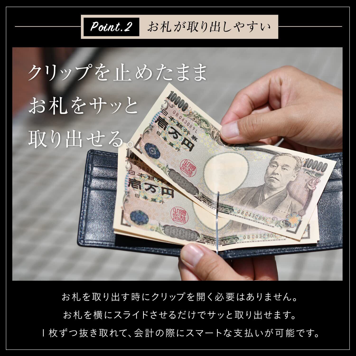【お札がしっかり止まるクリップ】グリップ力のあるクリップを使用しているので、お札が落ちることはありません。また、お札を取り出す時にクリップを開く必要はなく、お札を横にスライドさせるだけでサッと取り出せます。1枚ずつ抜き取れて、会計の際にスマートな支払いが可能です。また日本のお札はもちろん、ドルなど海外のお札も納まるので旅行にもご利用頂けます。