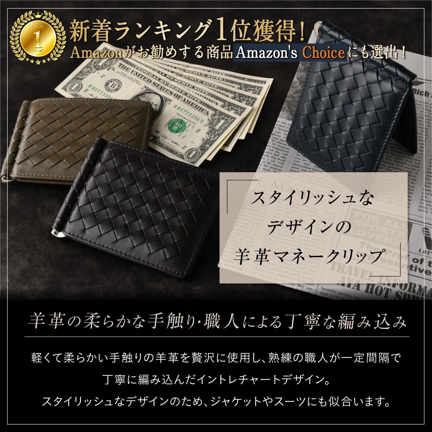 [FELIX STELLA] マネークリップ メンズ 本革 【滑りにくい羊革製】 軽い 薄型 二つ折り 財布 札ばさみ カード入れ付き 編み込み シープスキン メッシュ (ブラック)