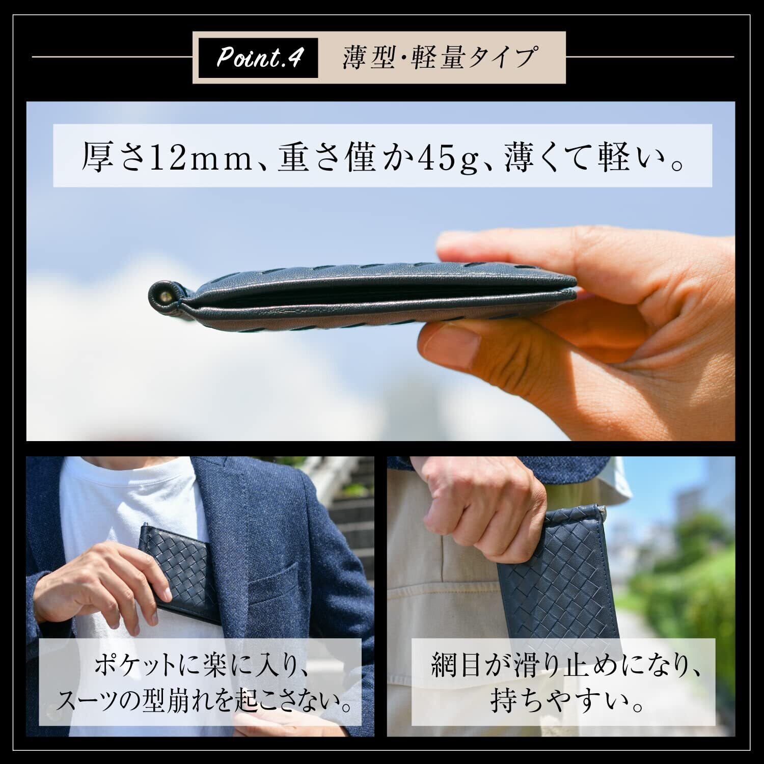 【薄型だからポケットに入れても膨らまない】厚さ約1.2cm、重さ約45g、薄くて軽いアイテムです。ジャケットやパンツのポケットに入れても膨らまず、スマートなシルエットを維持できます。