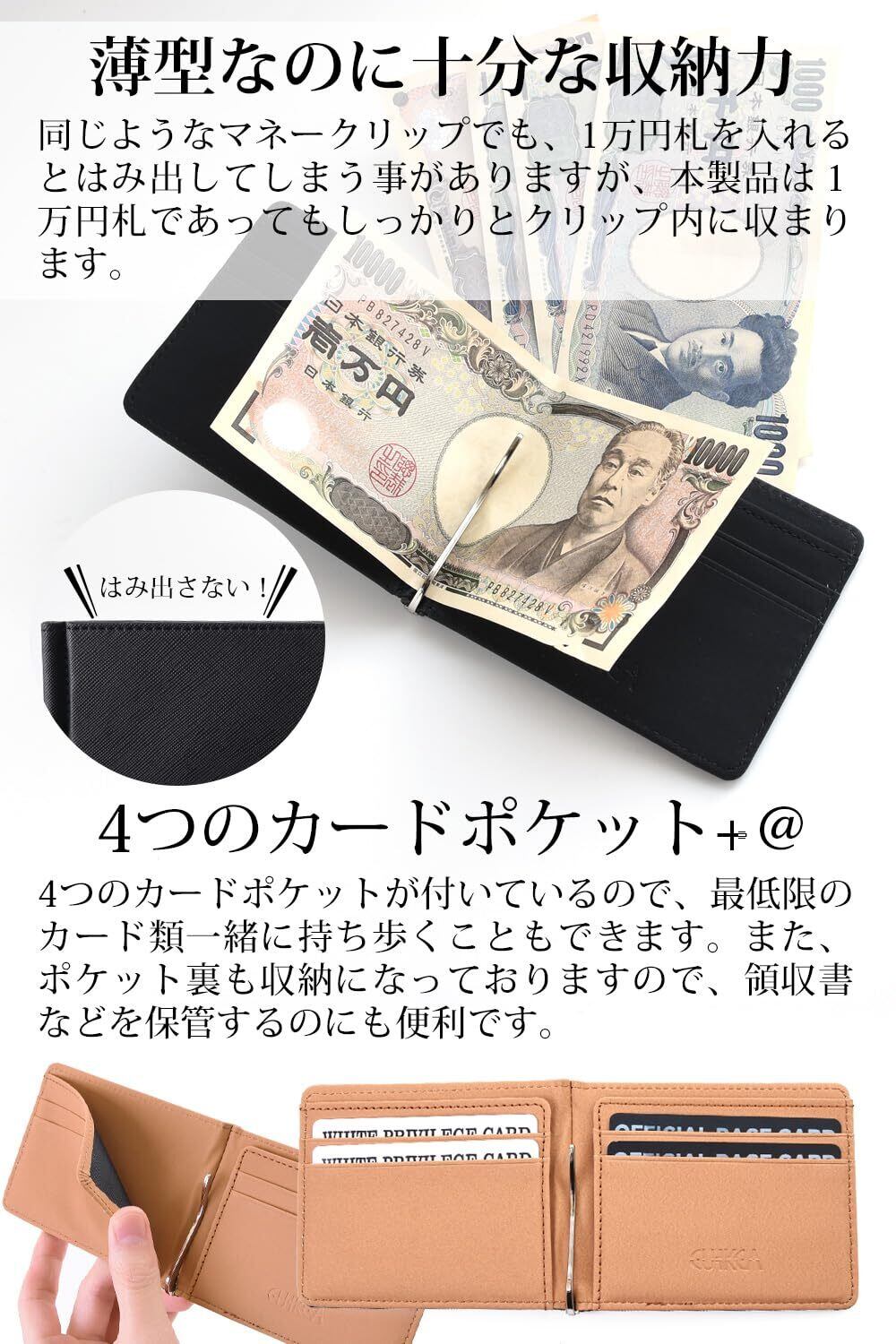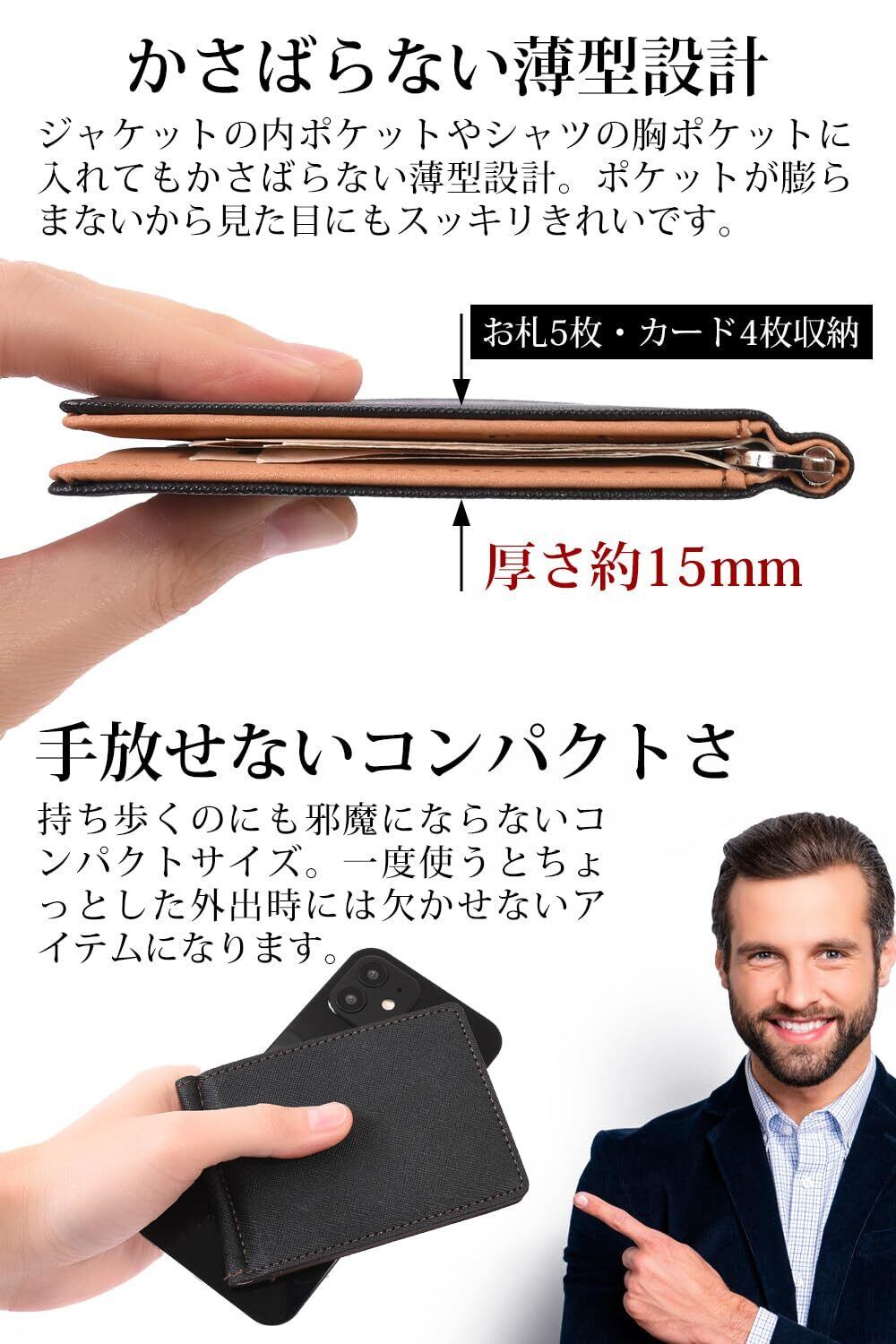 プレゼントした相手に「こんなの欲しかった!」と言ってもらえるギフトです。さらに、黒のギフトボックス付きでプレゼントにも最適ですまた、スリムなズボンをはいていて、膨らんだお財布がポケットに納まりきらないときや、車の中に少しお金を入れておきたいときなど、様々な場面で活躍してくれます。
