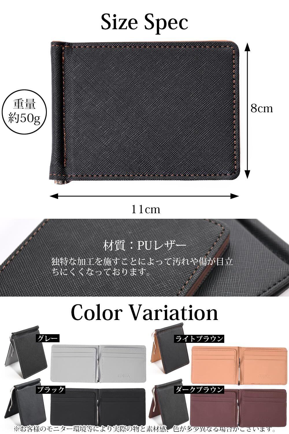 ●「素材」PUレザー ●「種類」カードポケット×4枚/お札※札束ですが、厚みによって異なりますが、5枚~15枚ほどが最適です。※画像をご確認ください ●「サイズ」※画像をご確認ください ※お客様のモニター環境等により実際の物と素材感、色が多少異なる場合がございます。