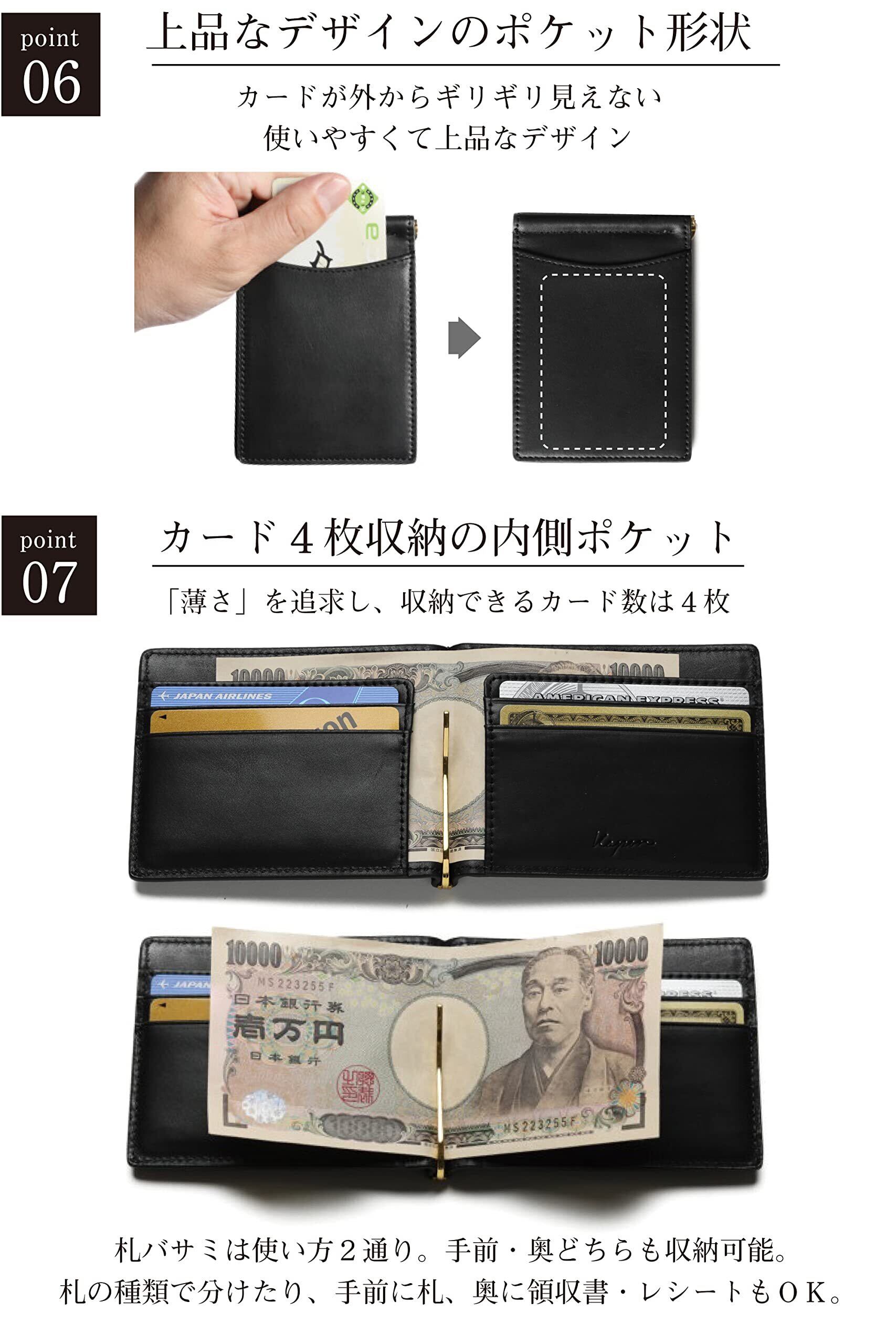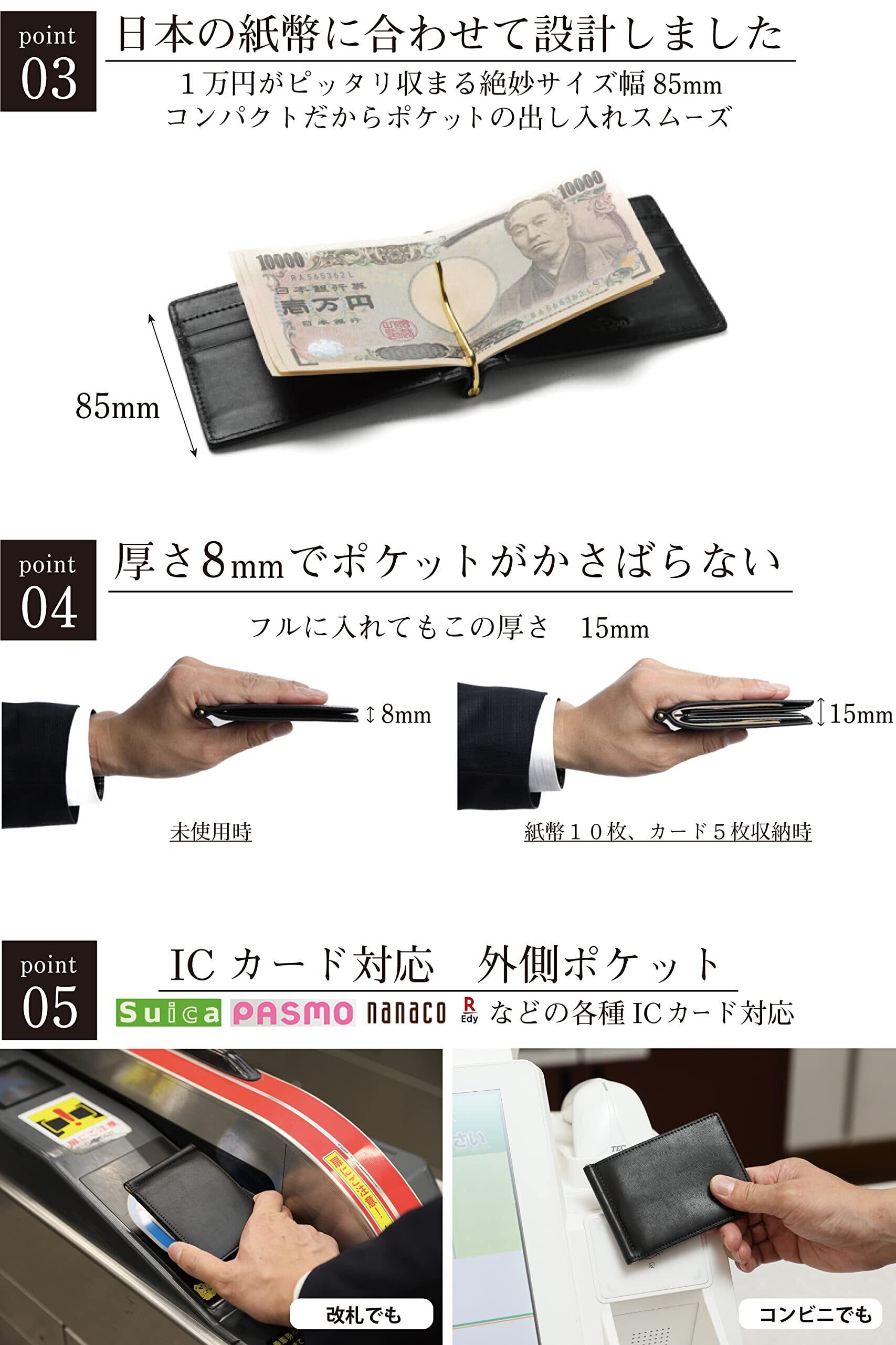 【薄さ+使いやすさを追求した絶妙なサイズ感のマネークリップ】(業界最薄レベル)厚さ8mmでポケットが膨らまない、見た目の美しさにこだわりました。一万円札がピッタリ収まるタテ85mm幅。スーツやYシャツ、ズボンのポケットの出し入れが非常にスムーズです。