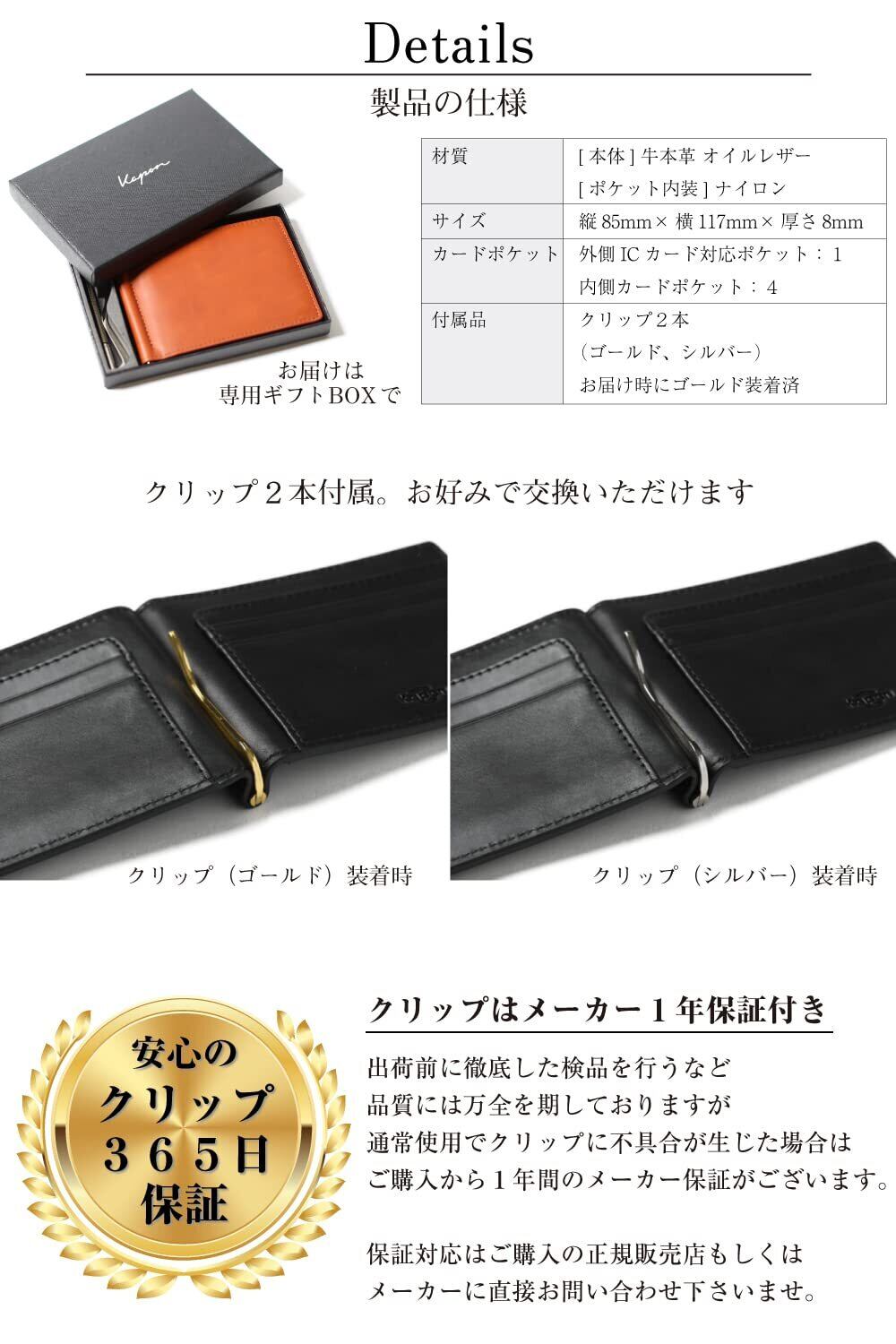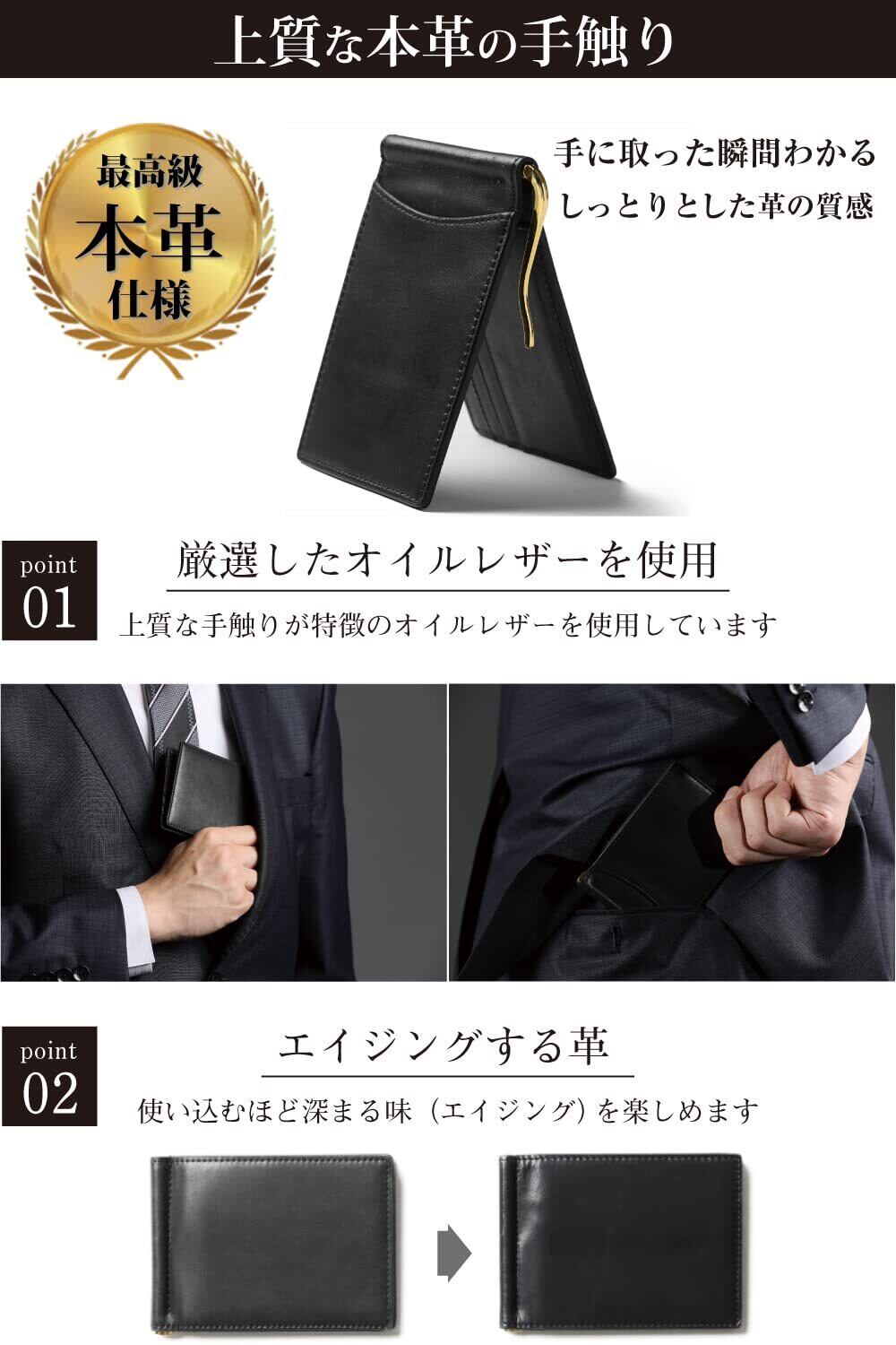 【在庫限り】[Kapon] マネークリップ メンズ 本革 オイルレザー クリップ2本(ゴールド・シルバー) 付属 ギフトボックス 付き 二つ折り 財布 札ばさみ 薄い 軽い (ブラック)