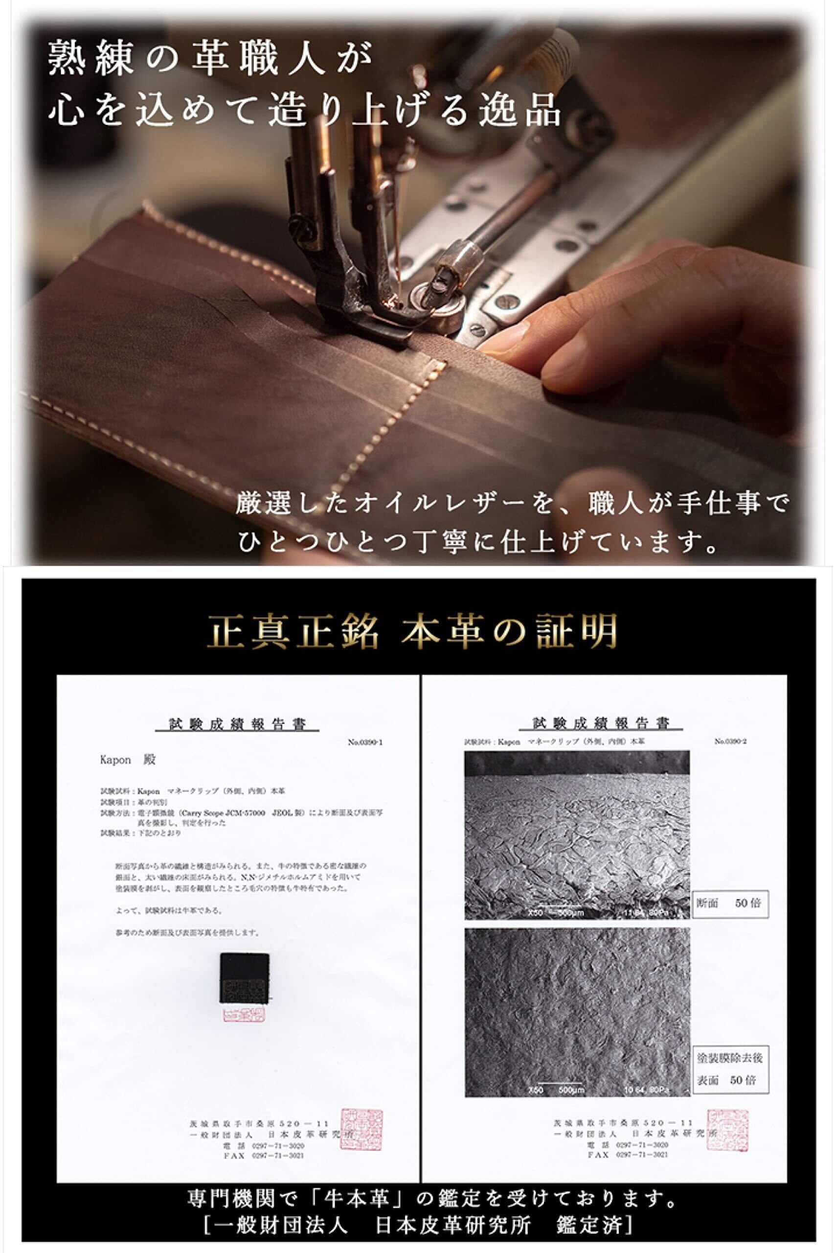 【本物のオイルレザー(牛本革)を贅沢に使用】外側・内側ともにオイルレザーを使用。本革ならではの優しい手触りと高級感があります。本革の特徴である「使うほど味と深みが出る」(エイジング)で、2年、3年とお使いいただくことでアナタだけのマネークリップができあがります。キズに強く、細かなひっかき傷も、通常のポケットの出し入れや手でこするなどの軽い摩擦でキズが徐々に目立たなくなります。クリップはゴールドとシルバー2本付属で、革の色にお好みの色合せでお使いいただけます(お届け時、ゴールドを本体にセットしています)。引き出しタイプのギフトボックスに入れてお送りしますので、大切な方へのプレゼントにも大変お喜びいただいております。