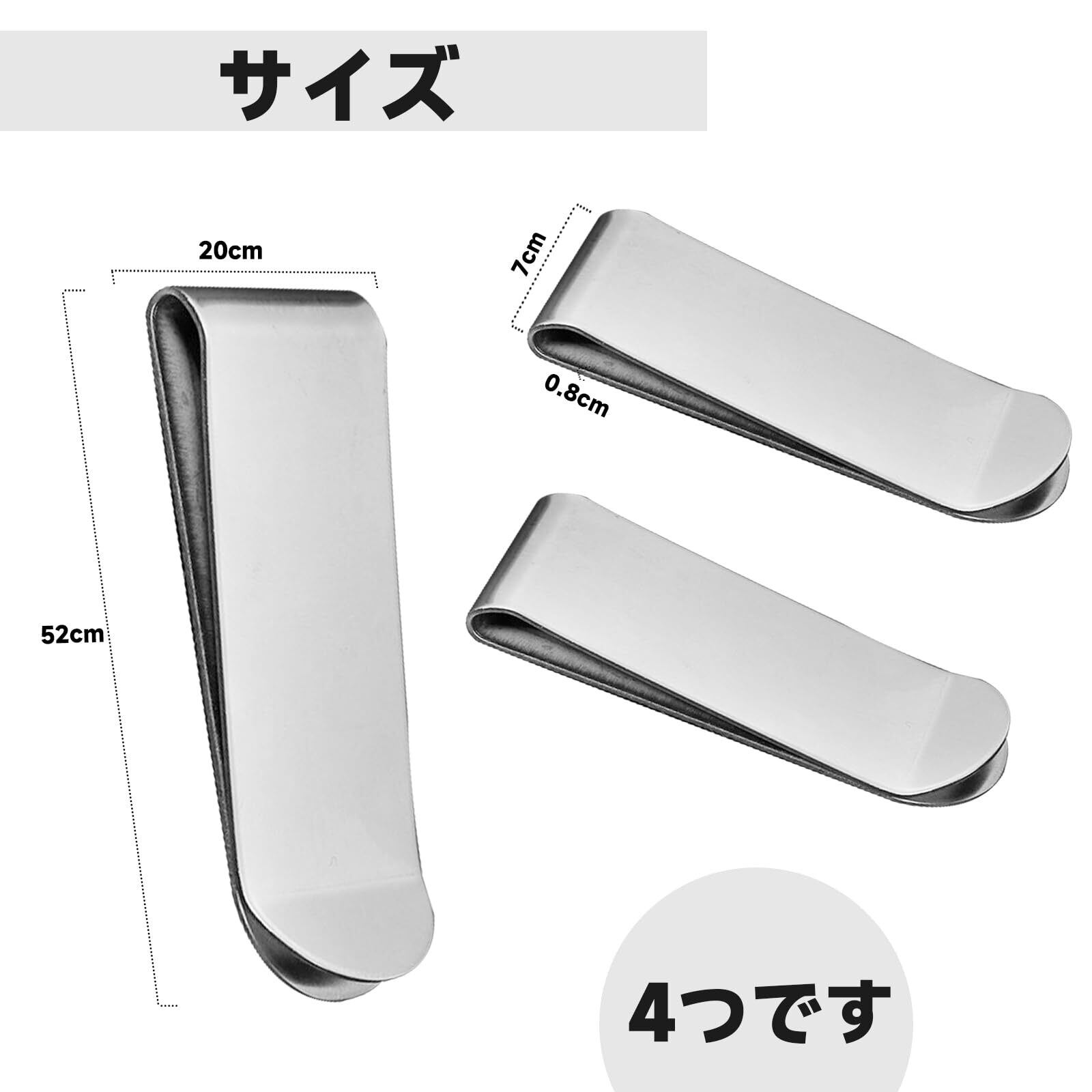 【商品の仕様】長さ約5㎝、幅約1.5㎝、1組4点のセットです。コンパクトで携帯にも便利です。薄型でコンパクトなサイズ設計で、ポケットにスッキリと収まるキャッシュクリップです。かさばらないので、持ち運びにも便利です。必要な時にさっと取り出せる機能性を備えています。