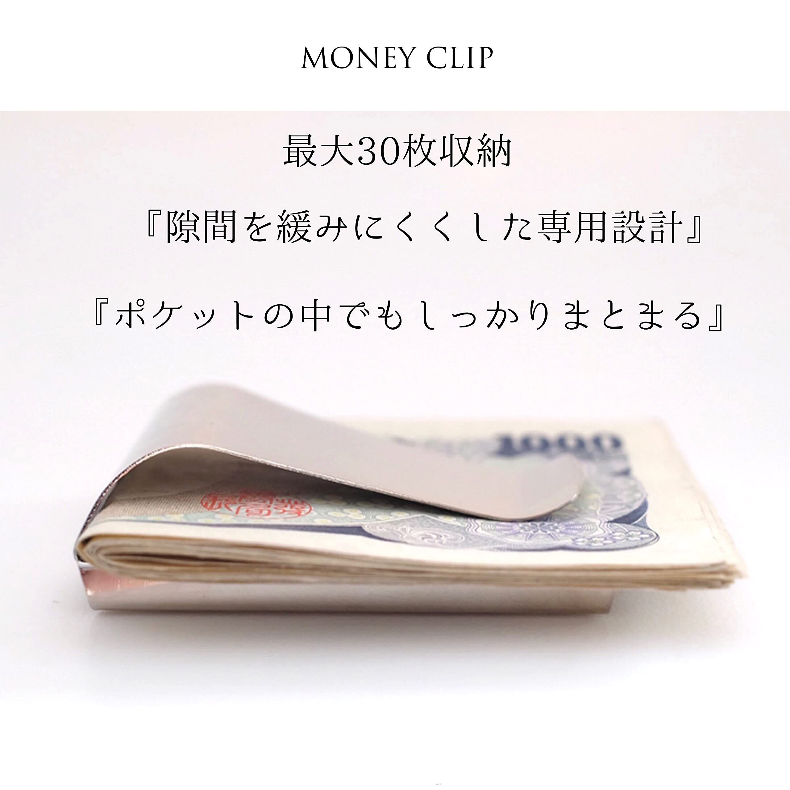 材質:ステンレス 最大収納容量 紙幣30枚、カード5枚(クレジットカード、一般カード、ICカード等) サイズ:縦55×横75×厚さ19mm (クリップ部分) 重量 29g