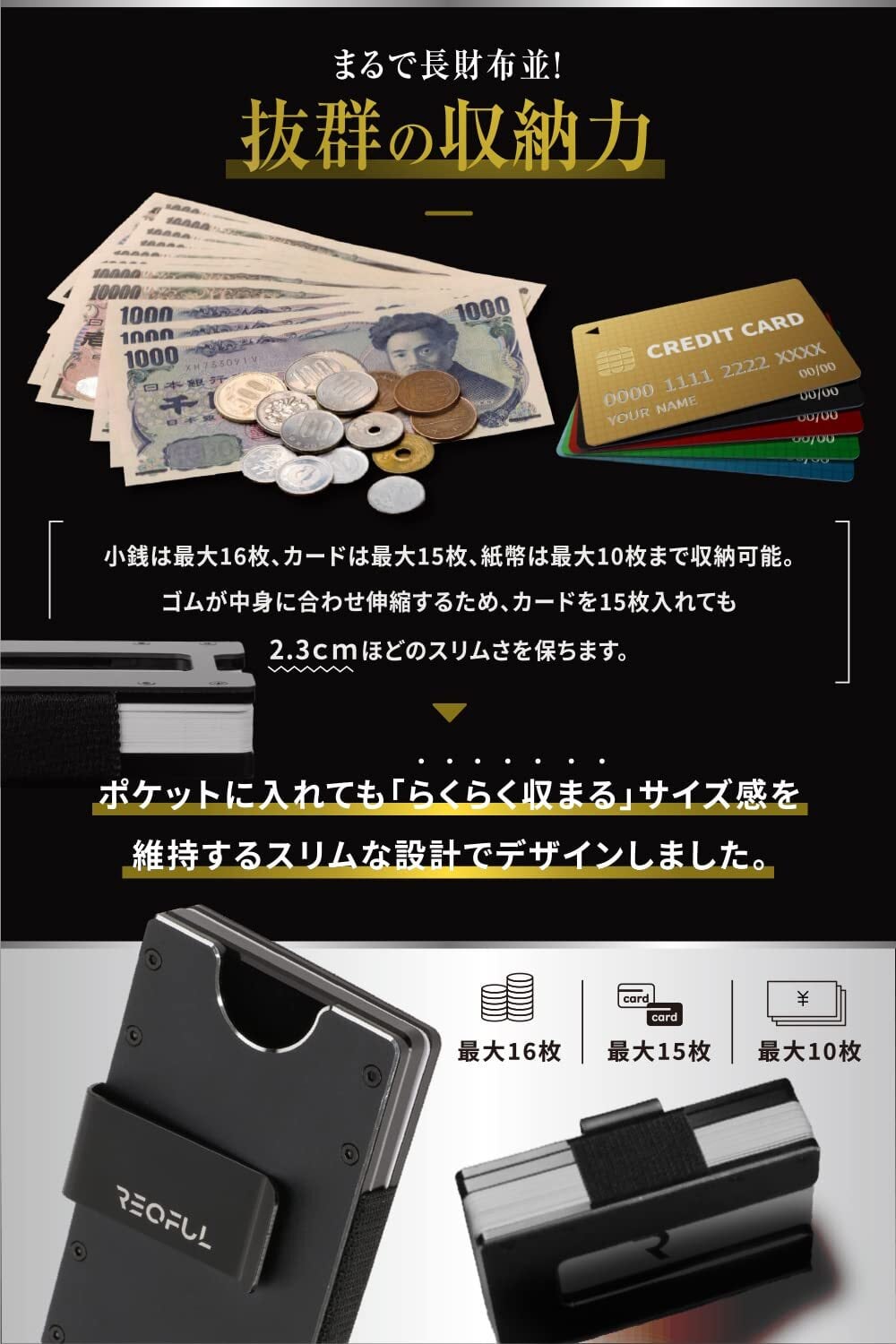 【特徴】お札をスムーズに収納できるマネークリップ付き新モデル。カード最大15枚 / 硬貨最大16枚 / 紙幣10枚程度が収納できるほどの大容量。高級感、超軽量、スリムさが魅力で、傷に強く、高い耐久性を誇る。