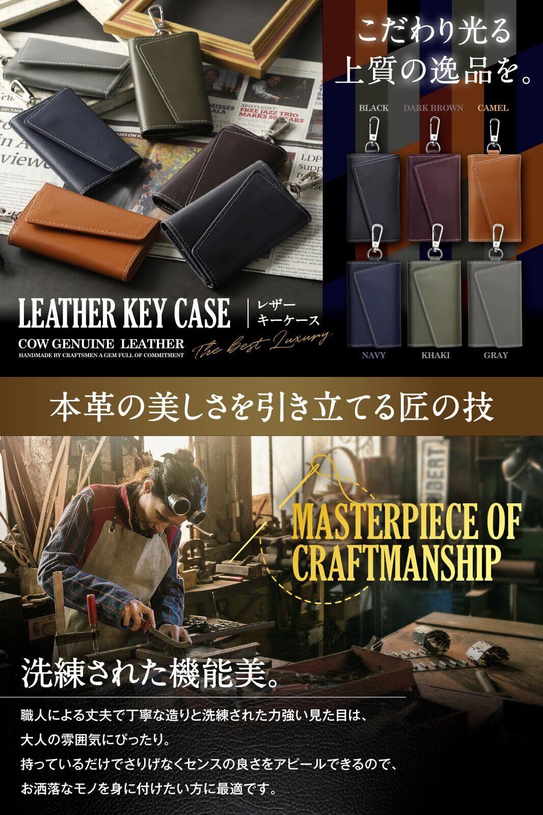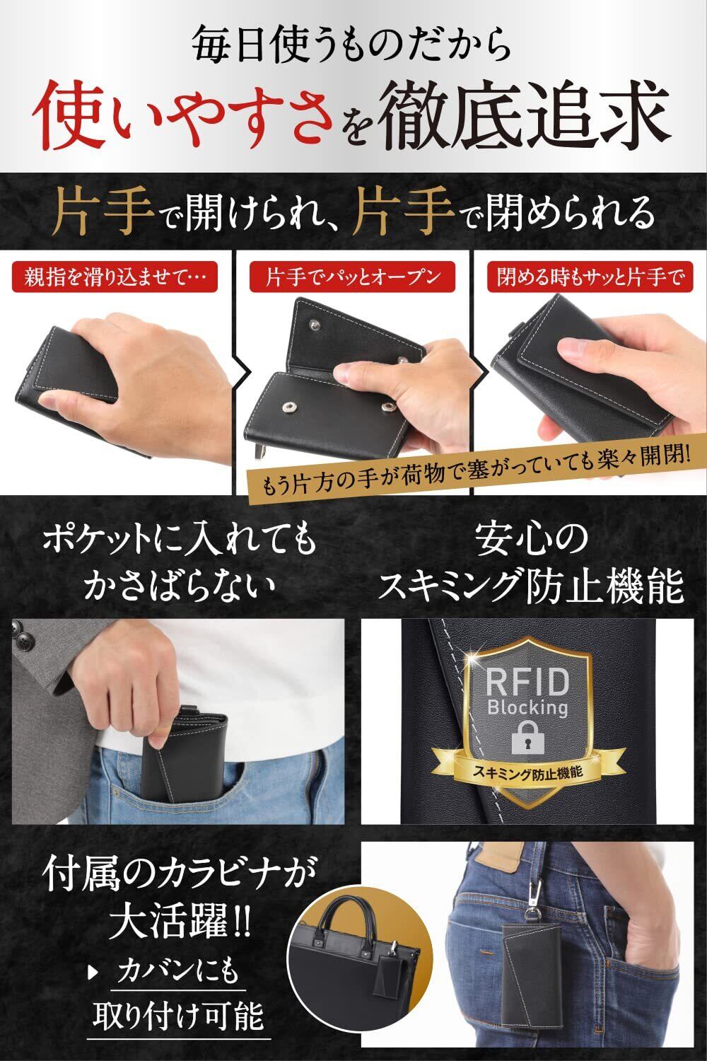 ①【特 徴】メンズ・レディースどちらにもおすすめできるシンプルなデザインでありながら高級感漂う本革製のキーケース。デザインだけでなく、大容量の6連フック、カード収納ポケット、便利なカラビナ付きと、とことんまで機能性を追求。フックは鍵の取り外しがしやすく、なおかつ誤って外れてしまわないタイプを採用。また、開閉に両手を使わないでいいように設計されており、片方の手が塞がっているシチュエーションでも楽々開閉できます。毎日使うキーケースだからこそ細部までこだわりました。自信を持ってお届けできる一品です。