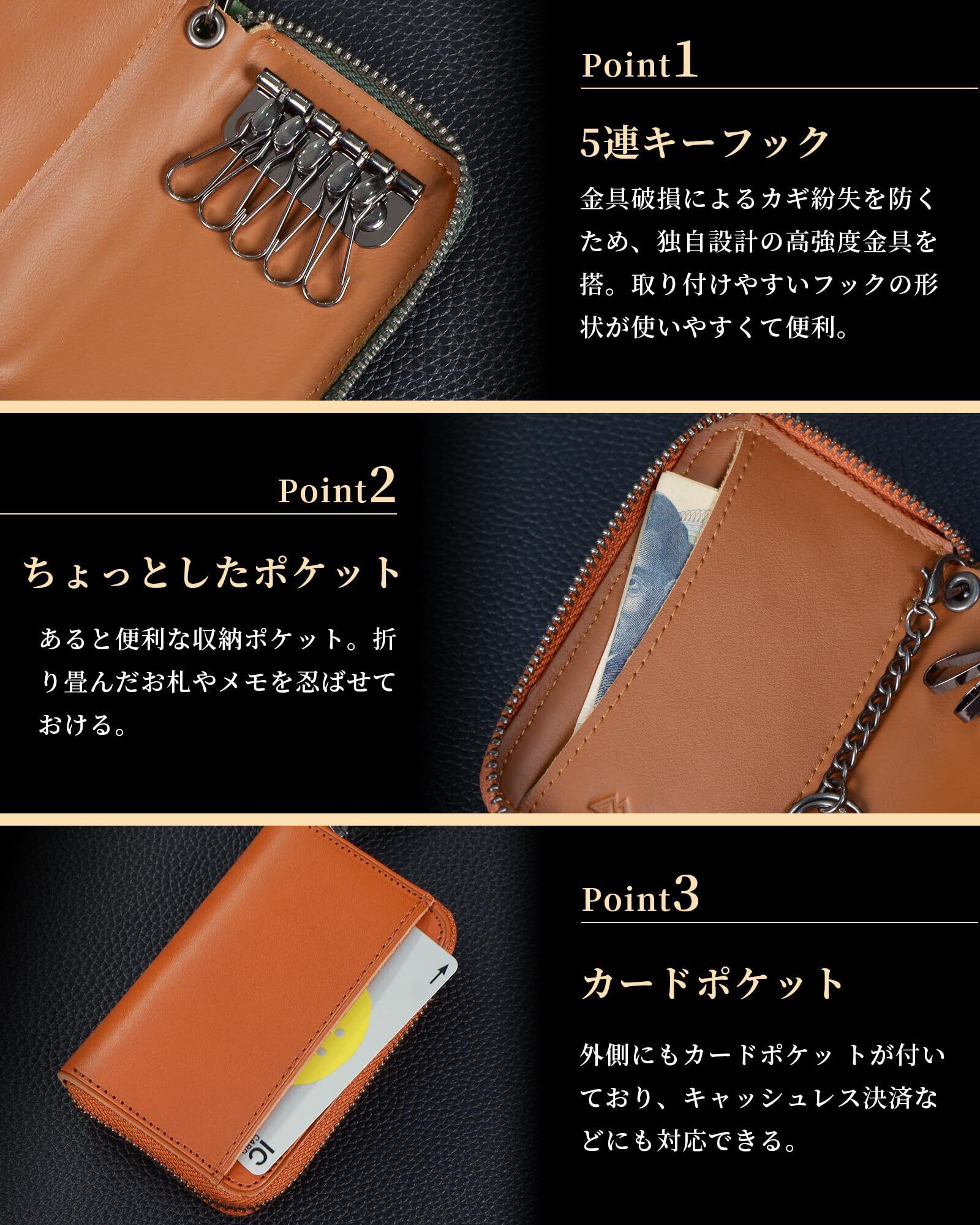 【多機能設計で便利】お財布機能、カード収納、キー収納機能性豊かな栃木レザー キーケース。 5連キーフック: 5本の鍵をしっかり収納できるデザインで、見た目もすっきり。カードも一緒に収納できる:毎日使うカギと一緒にカード類も収納できるので、キャッシュレス時代にピッタリな多機能 キーケースです。 便利な収納ポケット: 折りたたんだお札やメモをさっと入れておけるポケットも搭載。